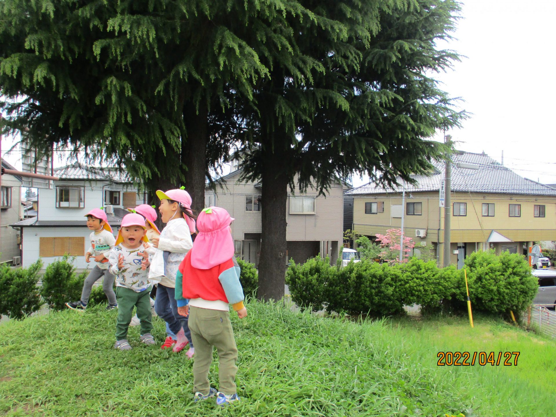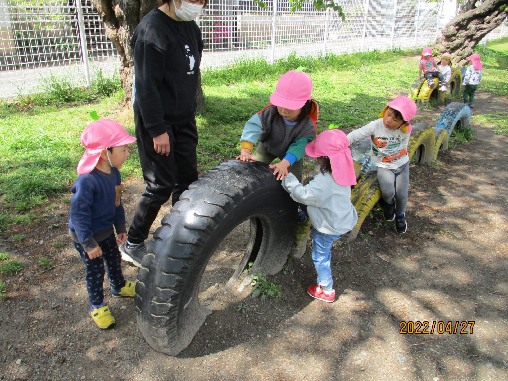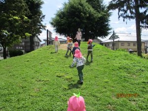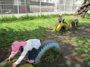 ・築山での登りおりやタイヤ登りを、全身を使って楽しむ姿がありました。今後も築山という色々な経験ができるフィールドを活用し、身近な自然に触れたり、遊びを通して体力をつけていこうと思います。