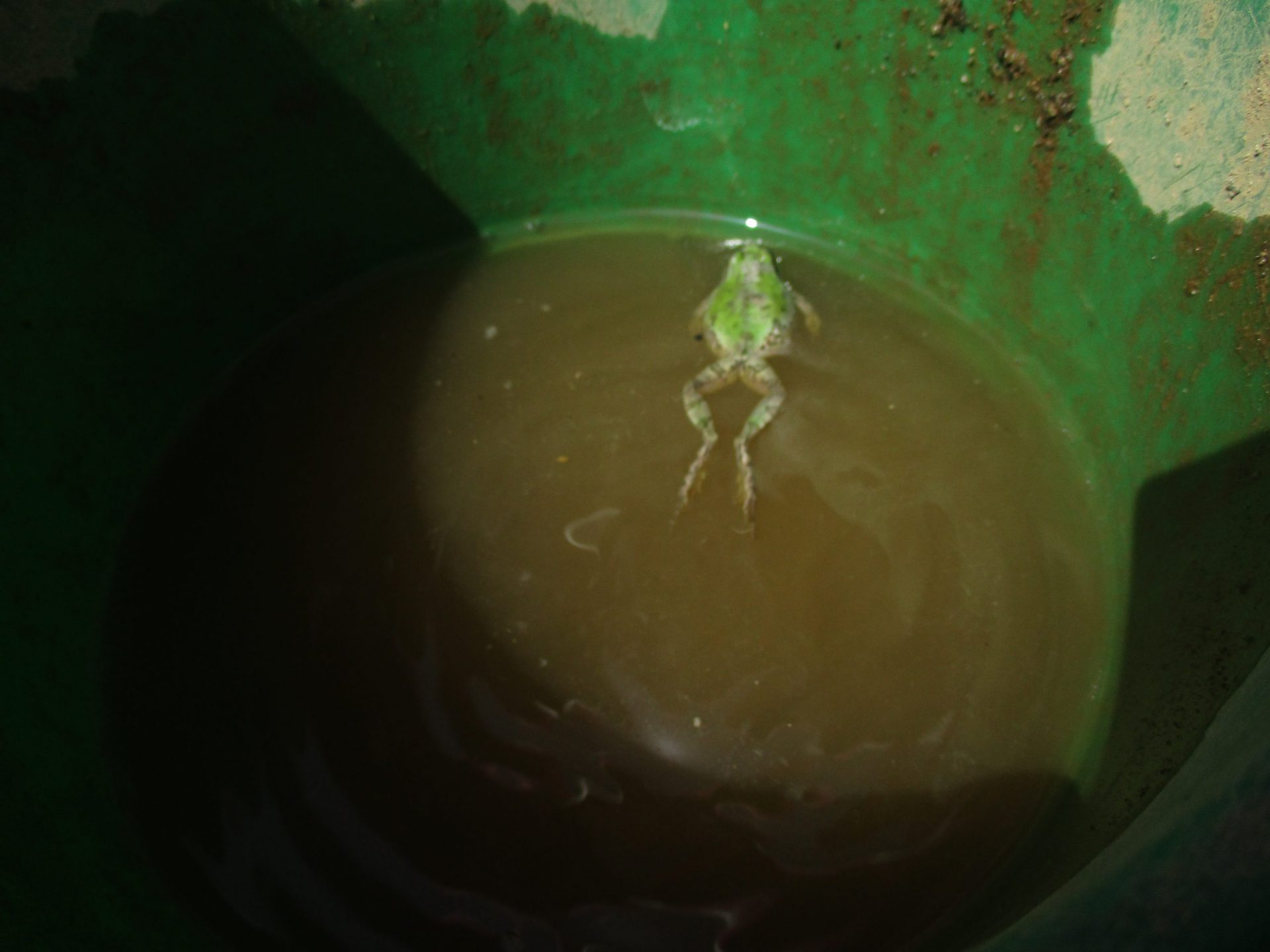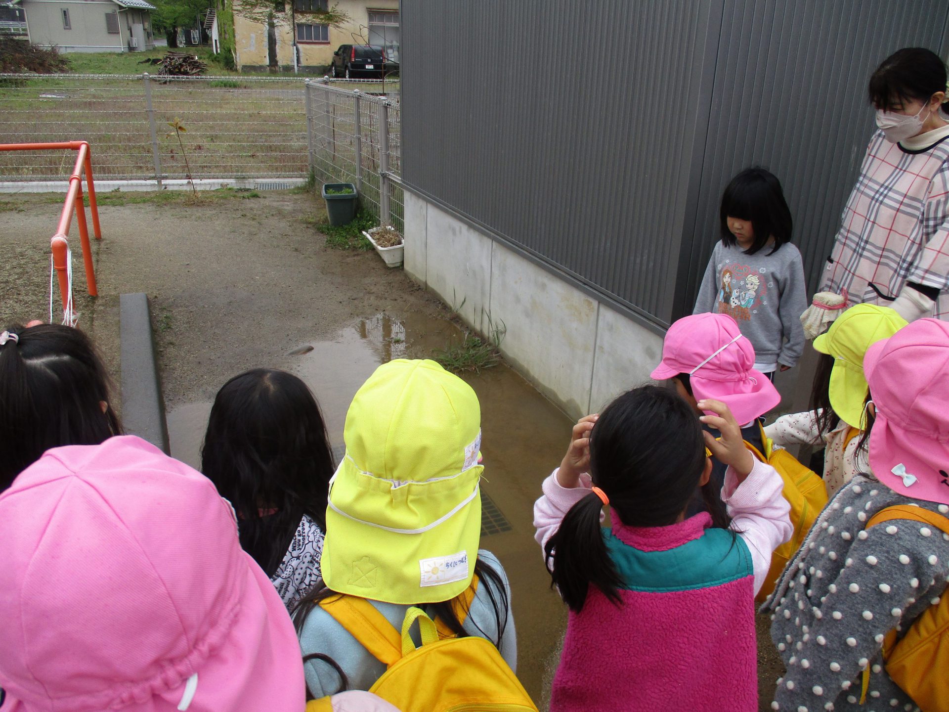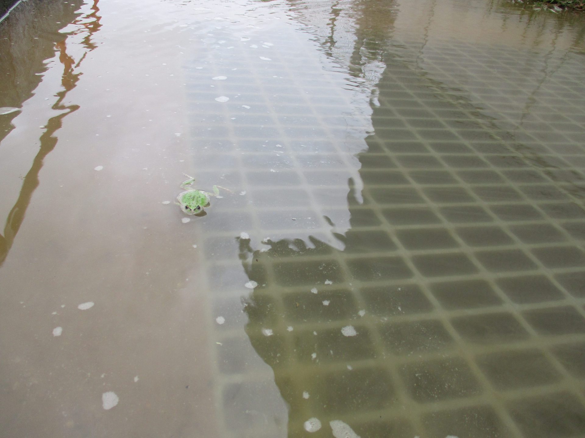 水たまりの中を泳いでいるかえるに「元気でねー」と