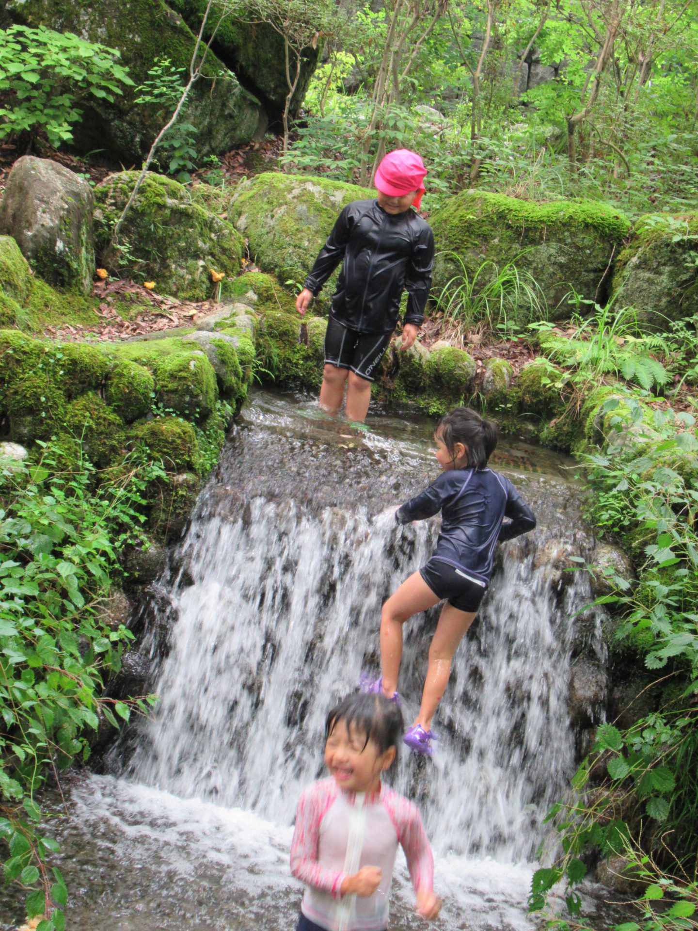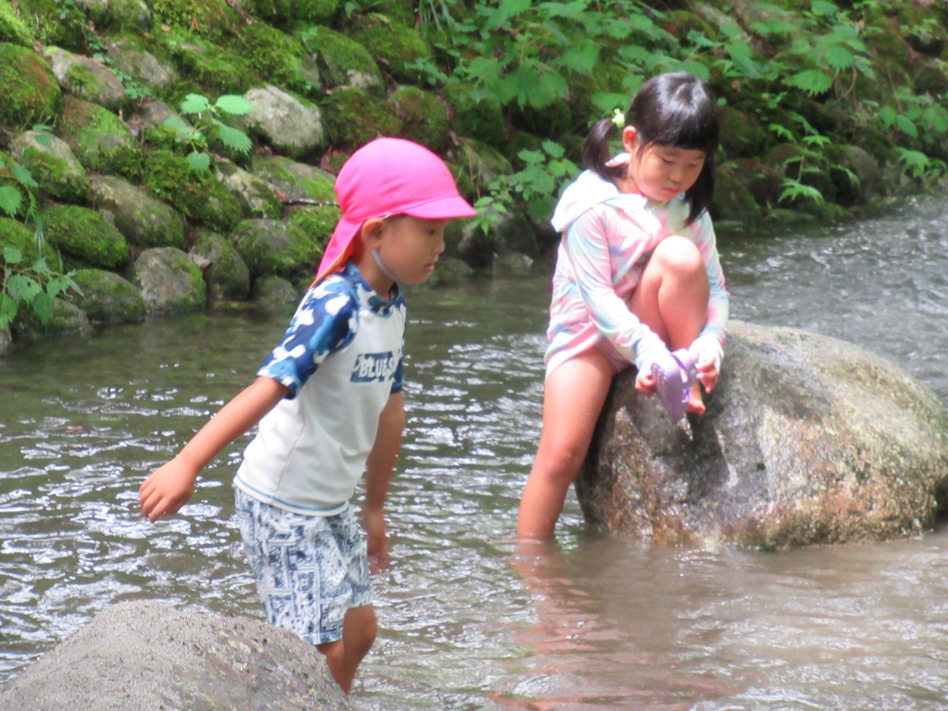 川の中でも魚や生き物を探したり石を登ってみたり友だちと一緒に喜んで遊んでいました。