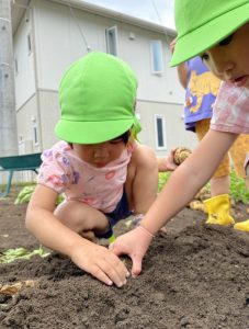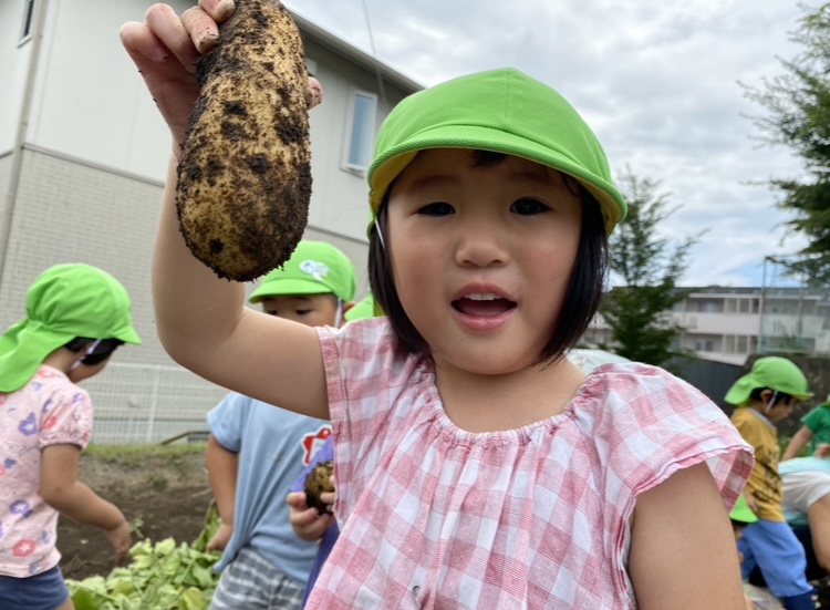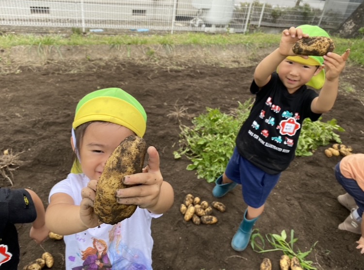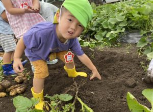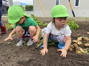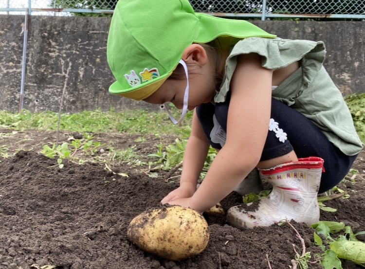 この経験を通して「ほかの食べ物はどのように育つのだろう?」といった好奇心に繋がっていってくれるといいなと思っています。また、みんなで収穫したじゃがいもが給食に出ると「ぼく(わたし)がとったじゃがいもだー!」と嬉しそうに食べていました。自分たちで育てたり収獲した食材は特別なようで食育にもつながっていくのかな。と感じました。
