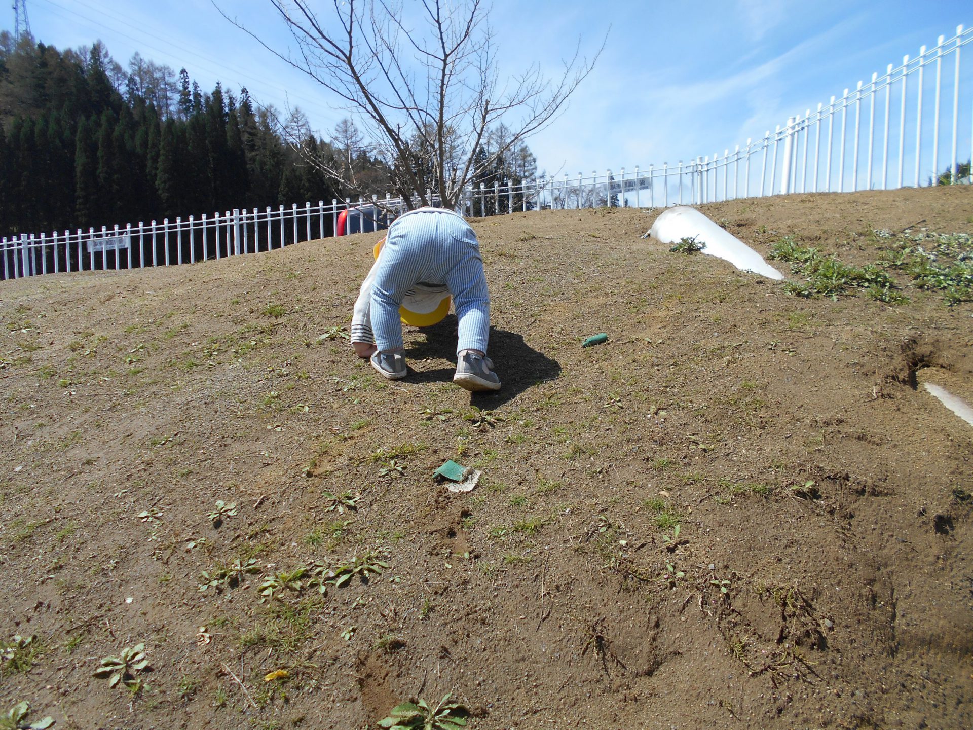 園庭の築山を登ります。段々と坂が急になってきました。(どうするかな?)と見ていると・・・
