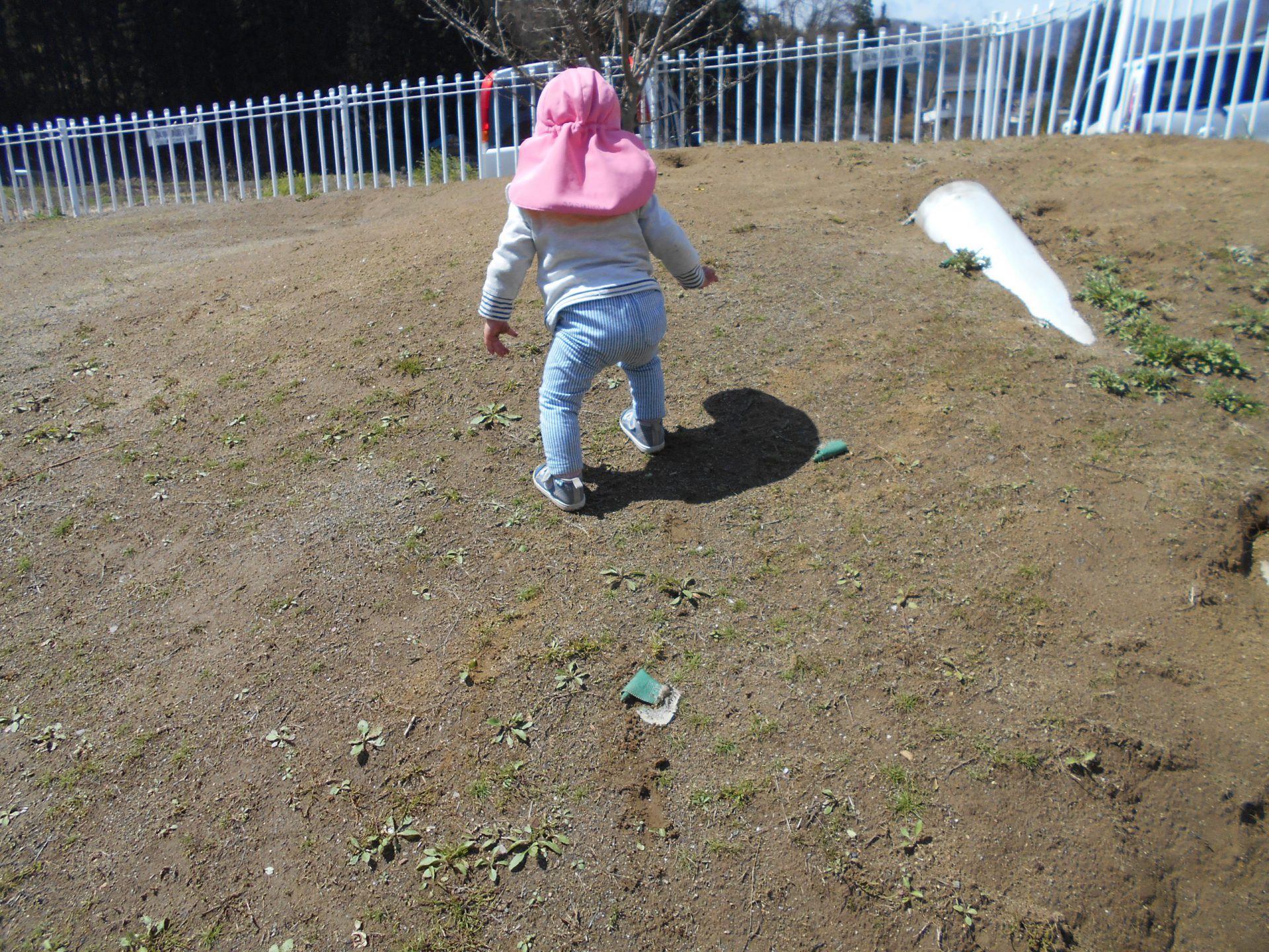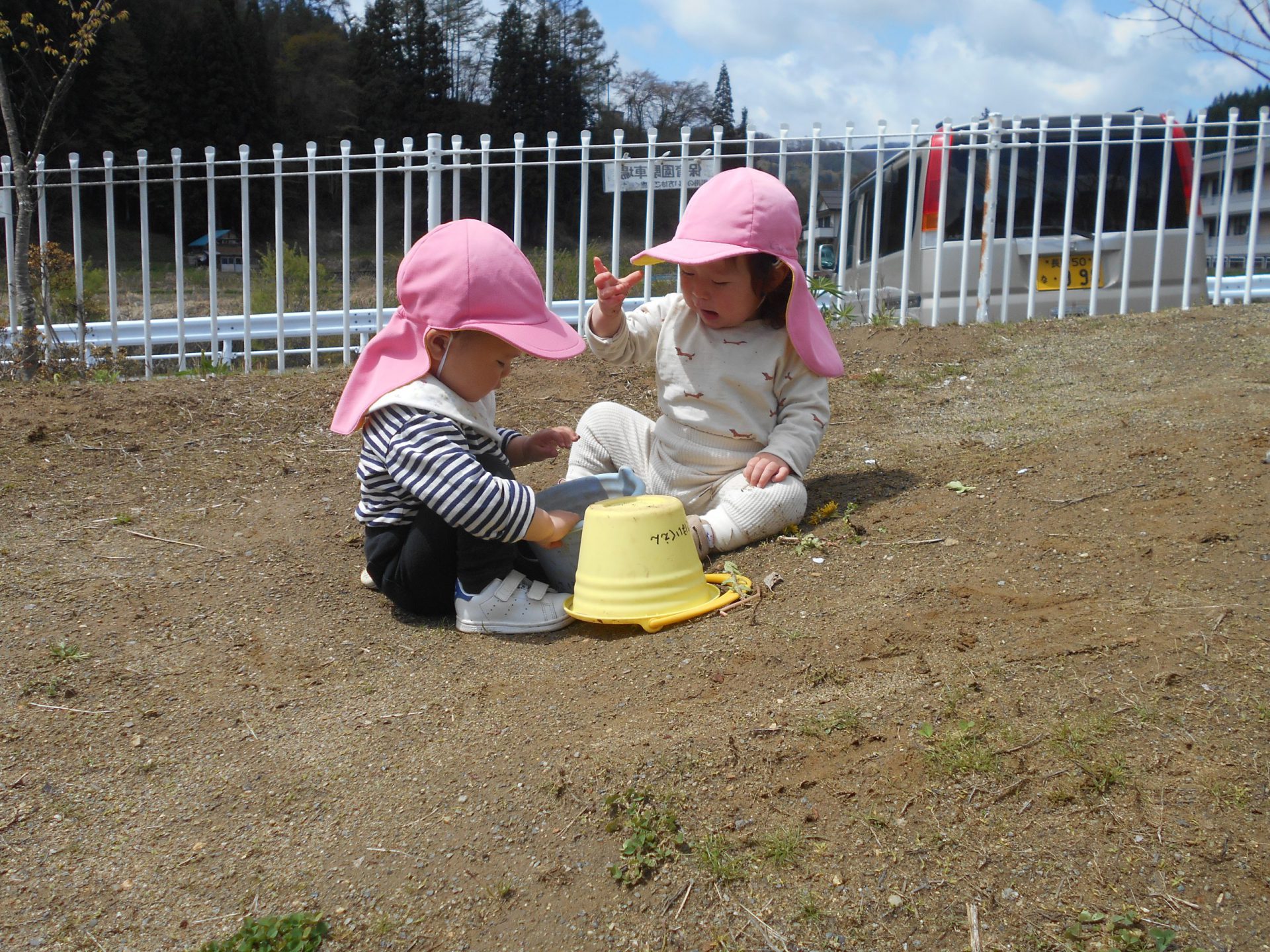 一人で築山登りに挑戦したお友達を待っていて、登り切ると一緒にバケツからお花を取り出して楽しみました。高いところで遊ぶ姿は、なんだかいつもより楽しそうに見えました☆