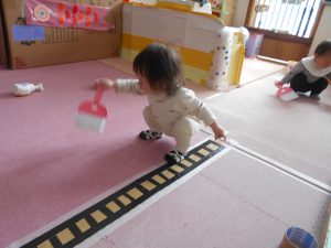 保育士が、ほうきで掃除していたのを見て、まねっこします。“これ、ほうきかな?”