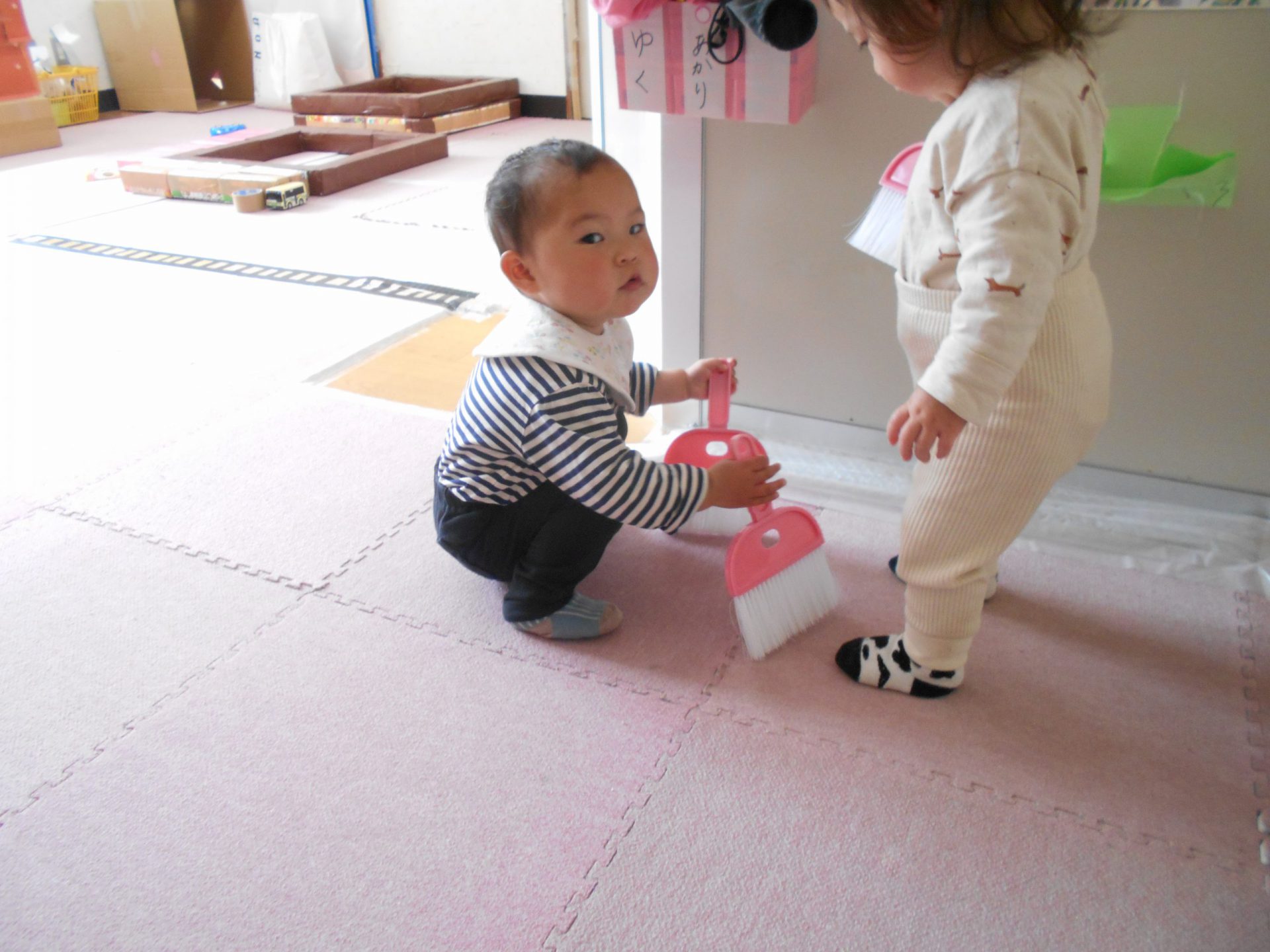 お掃除していると“なにしてるの?”とお友達がやってきました。“はい”とほうきを渡します。すると・・・
