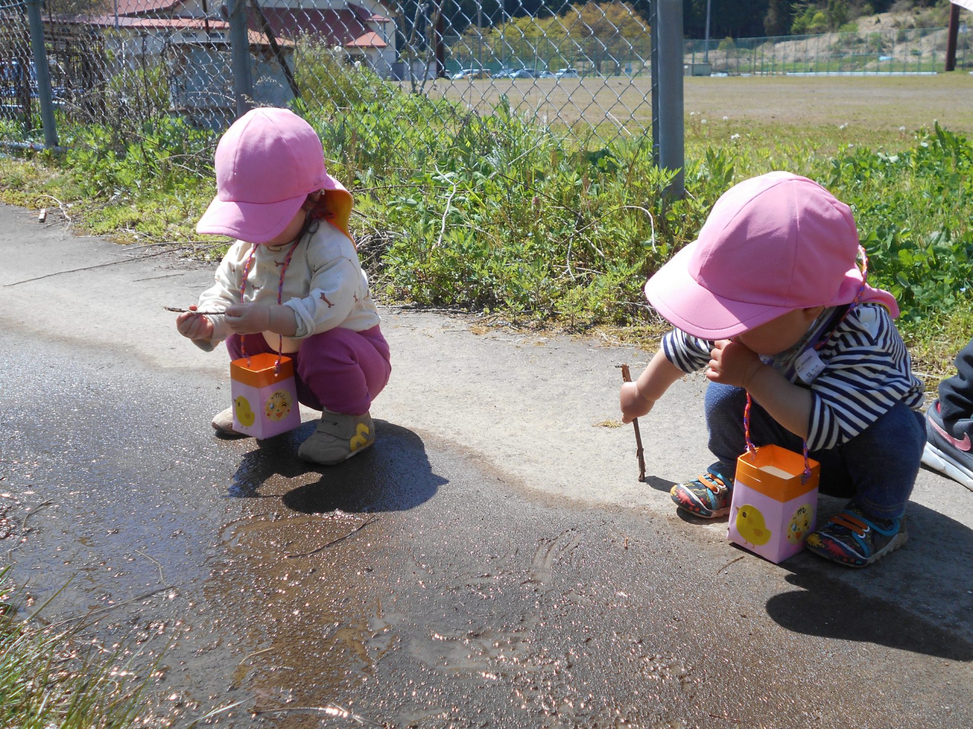 雨上がりのお散歩。棒の先っぽで水や泥をツンツン・・・