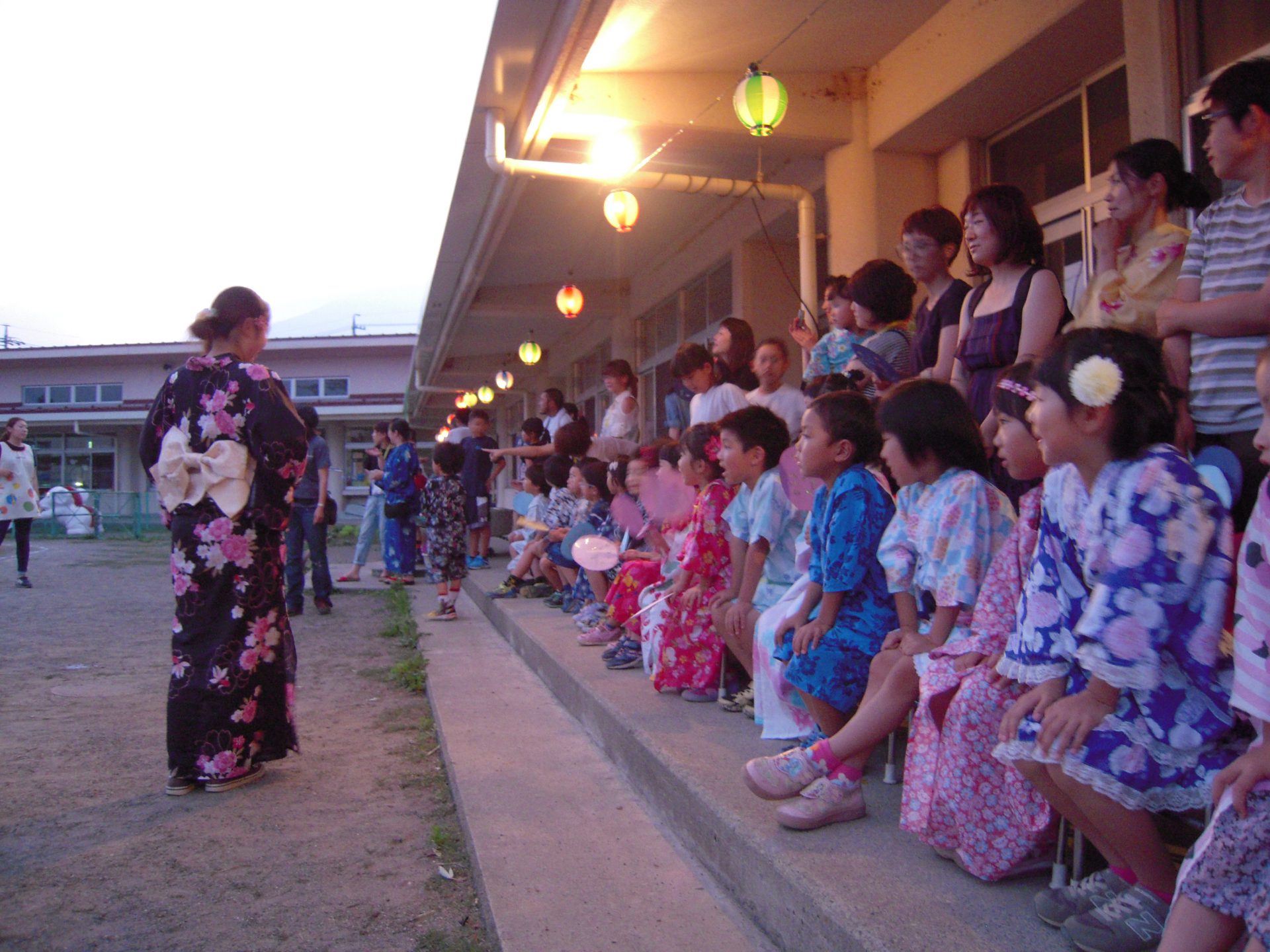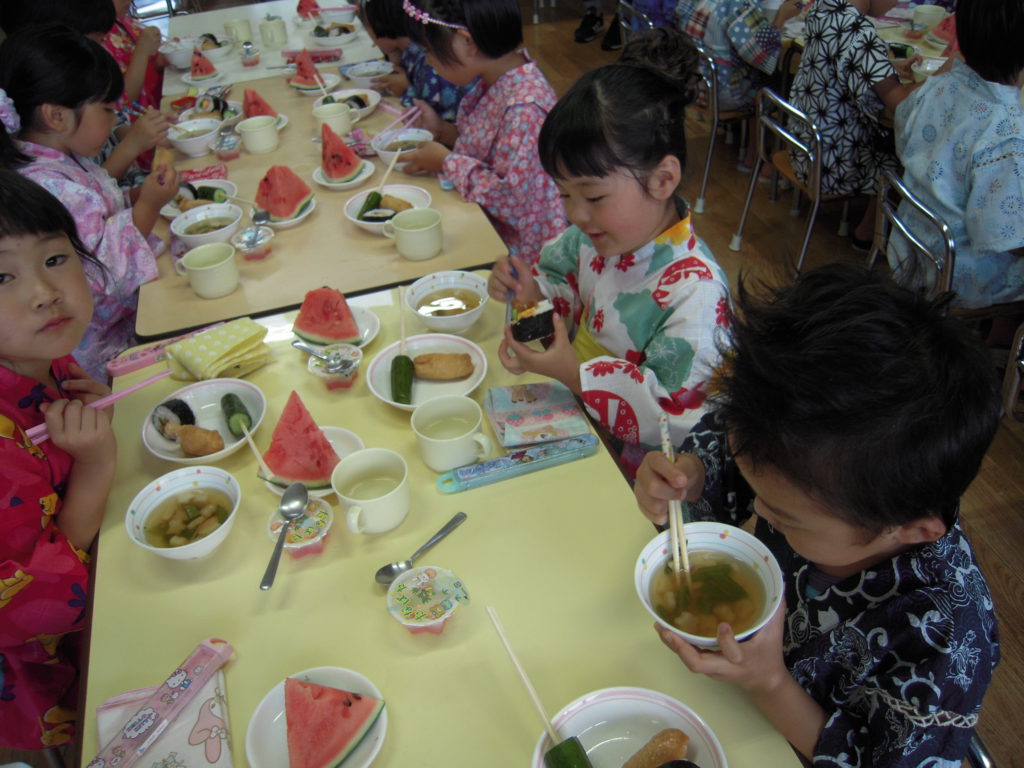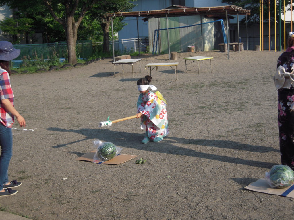 毎年恒例の年長児の夏の行事、年長さんだけ、ちょっとおめかしをして、夕方からのお祭りという嬉しさと、ゆったりと親子で楽しめる雰囲気も感じられました。