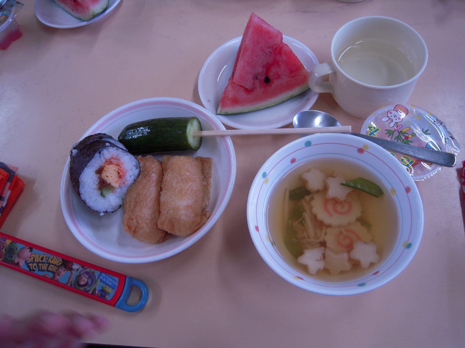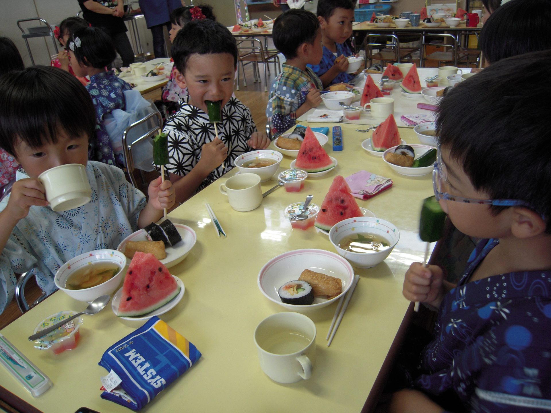 そこにきゅうりの浅漬けと、星のふのすまし汁、七夕ゼリー、みんなが頑張って割ったスイカが今日の夕ご飯です!
