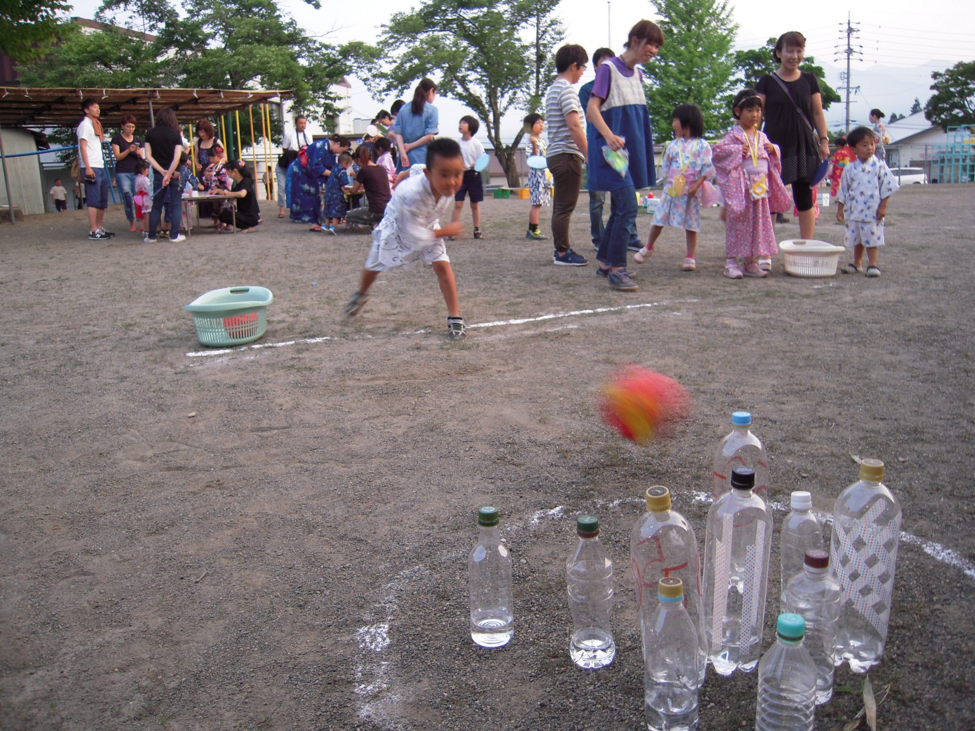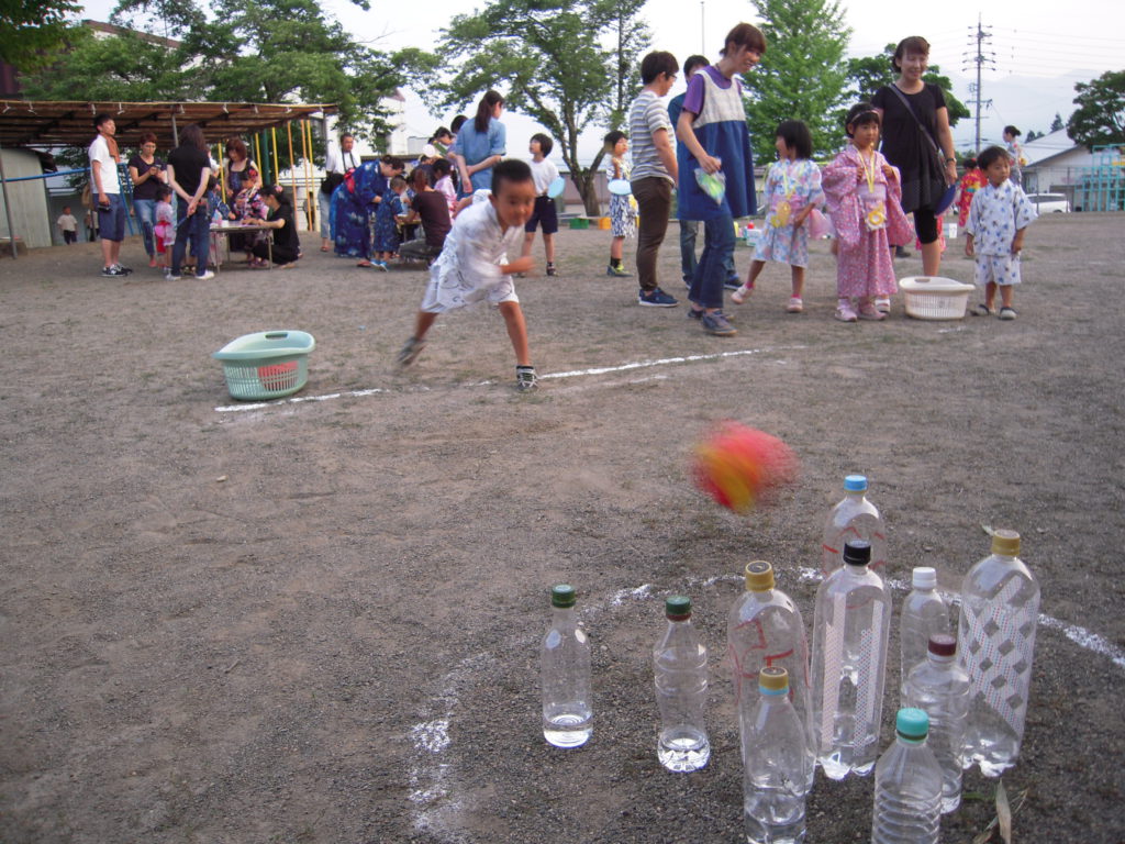 輪投げやボウリング、的当て、うちわ作りを楽しみました。