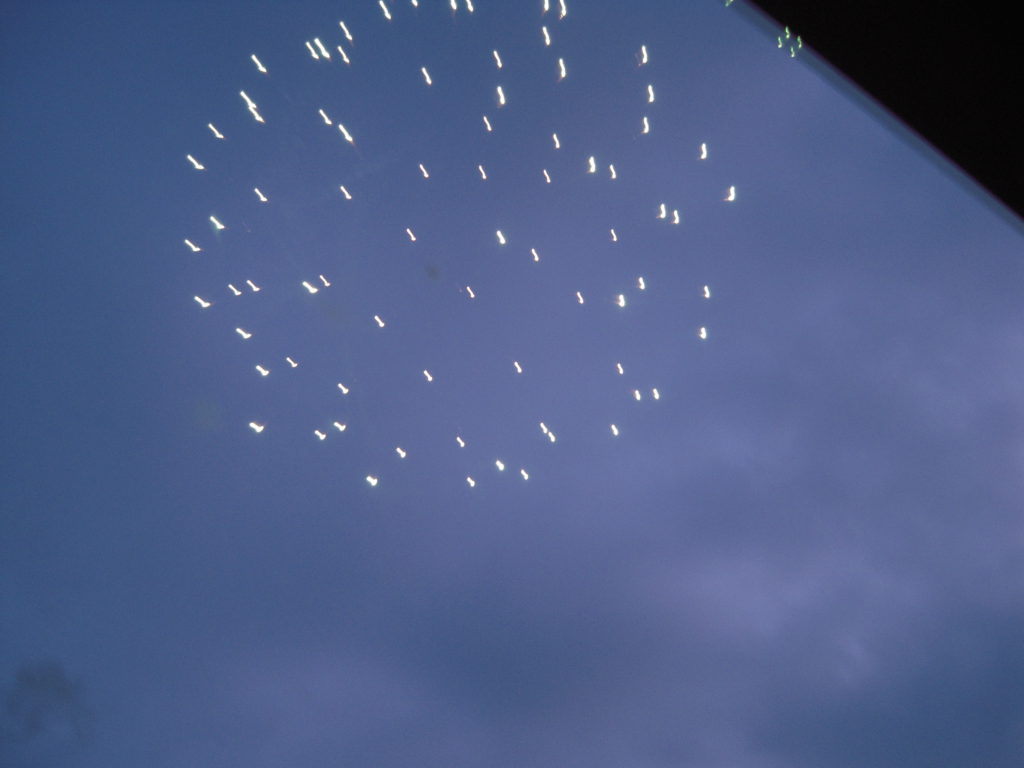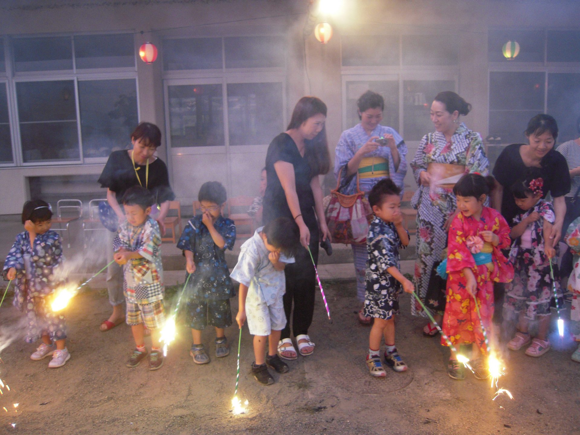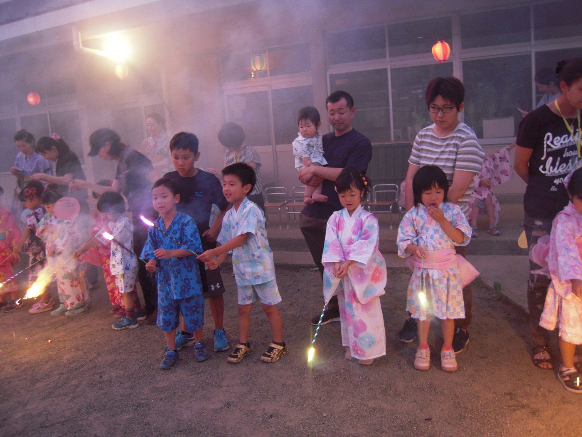 園舎の軒の内側にいた保護者の方々が、見えないですー!という想定外の出来事もあるくらい空高く本格的な打ち上げ花火をあげていただきました。(見えなかった方、申し訳ありませんでした)