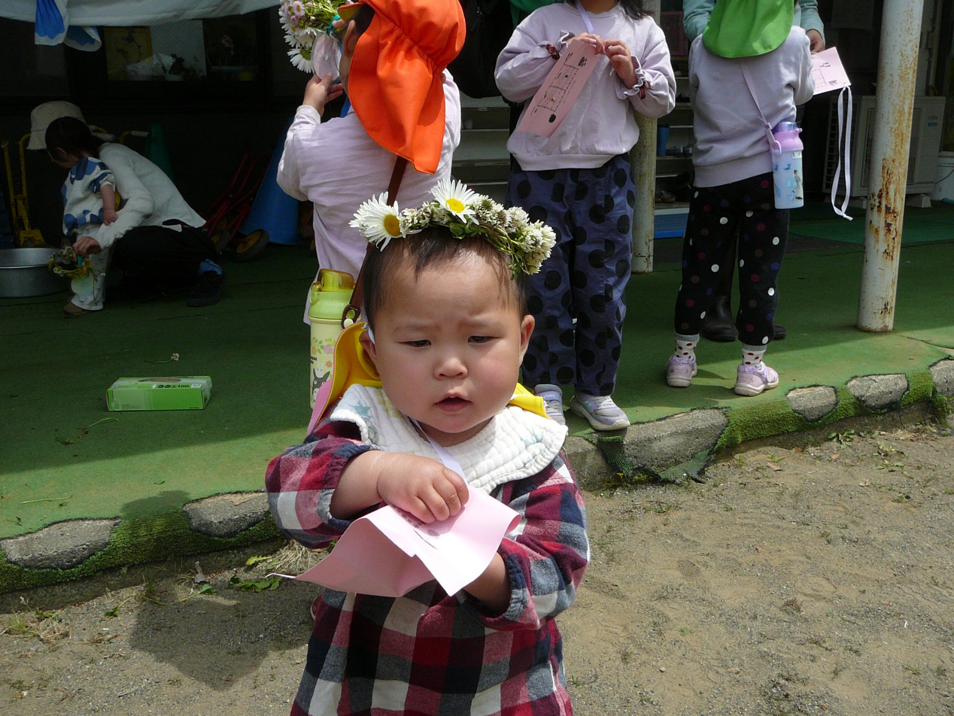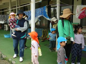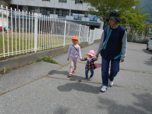 幼児さんに混じって、未満児さんも元気に歩いてきました。おうちの人と一緒に歩いて嬉しそうです。