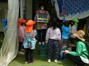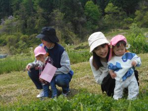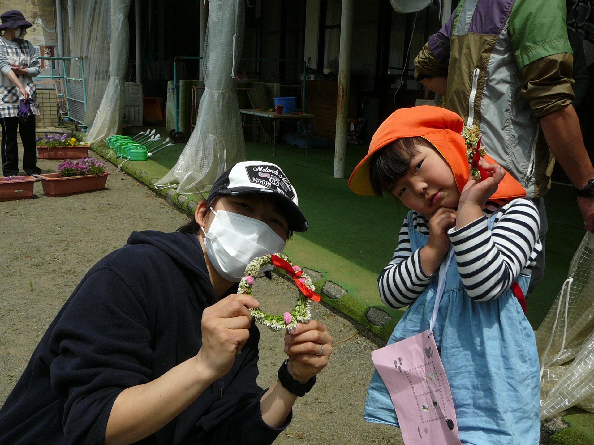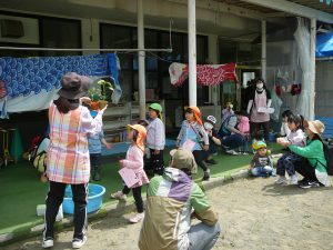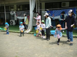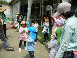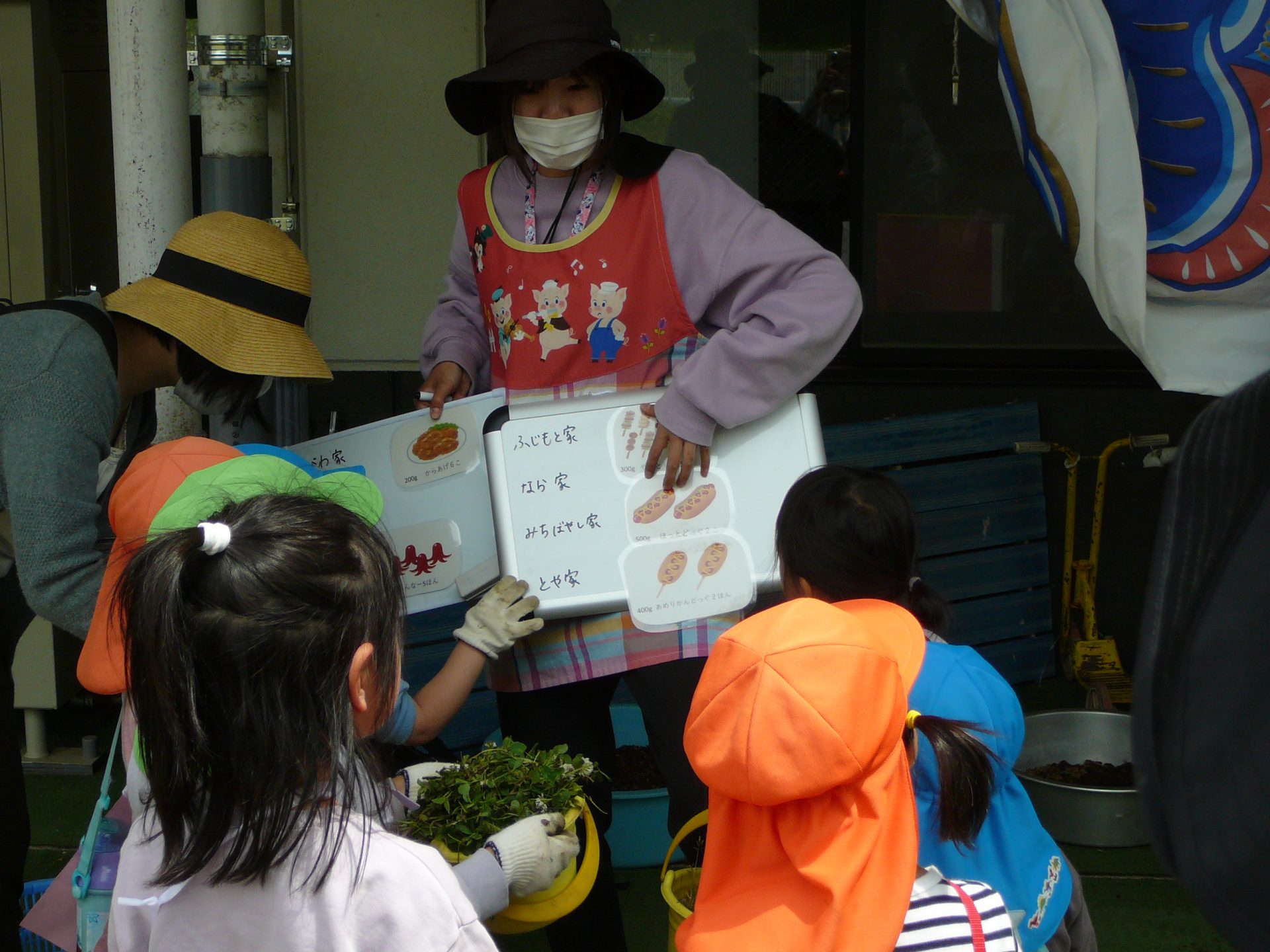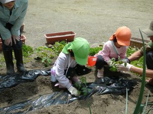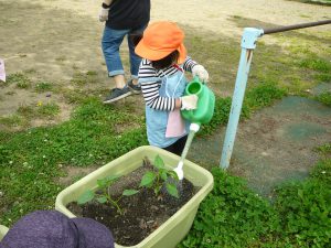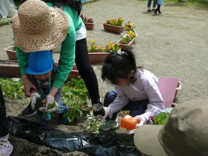 先日、地域の方と畑のお芋を植えたことを覚えていた子どもたち、植えたい野菜の苗を持って畑やプランターに向かいます。