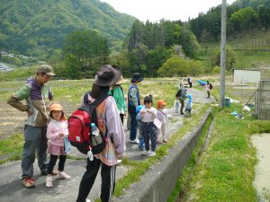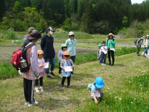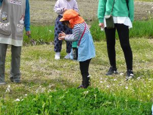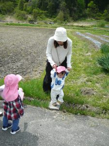 田んぼに入れてあげました。「およいでる!」見事なカエル泳ぎです。