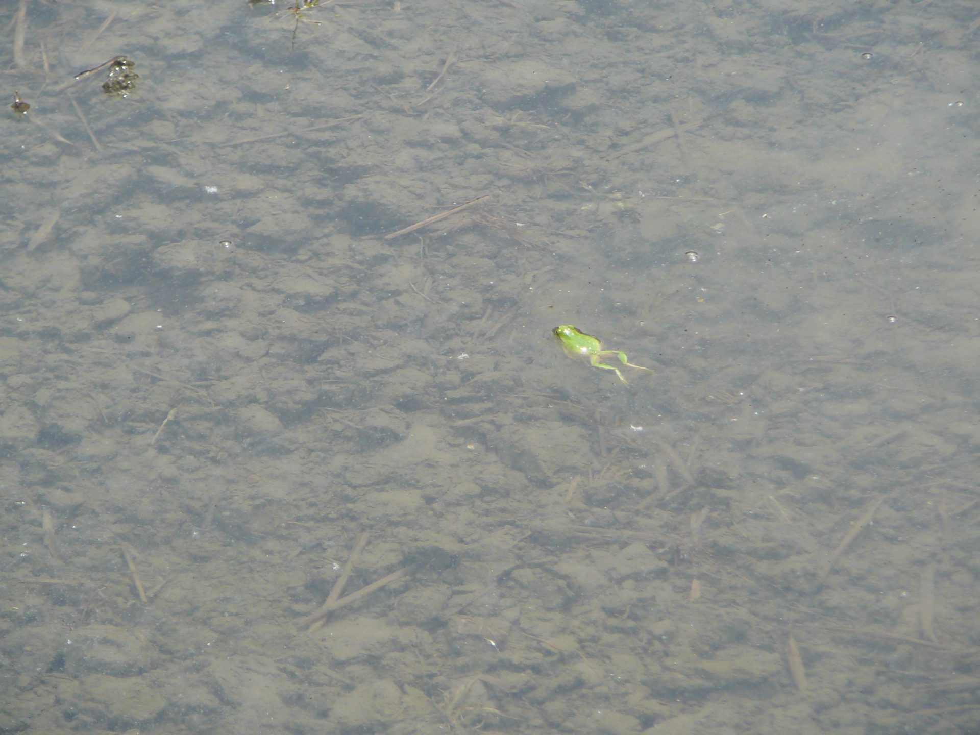 用水路を渡って池に来ました。「カエルいけだ!」今日もカエルの鳴き声が響いていました。