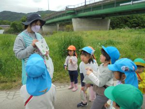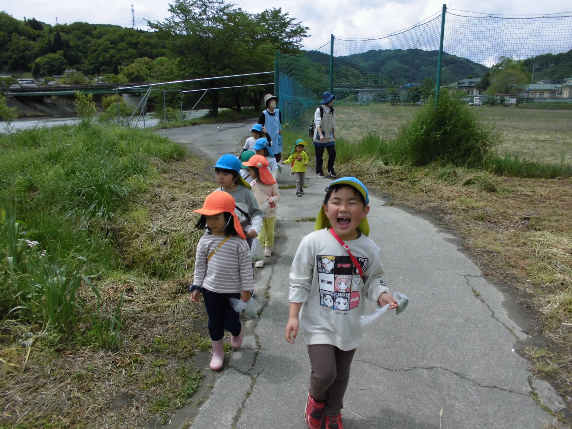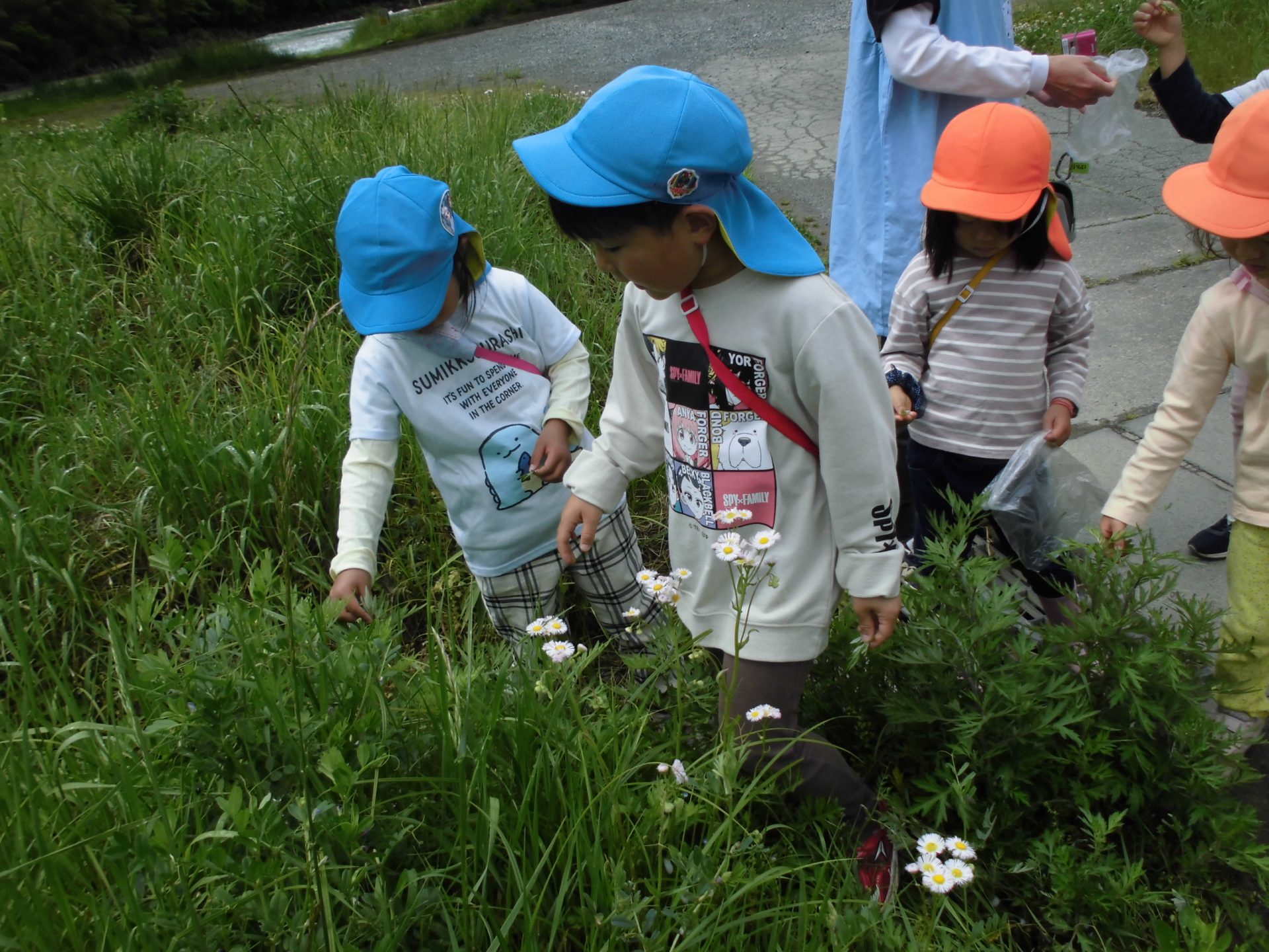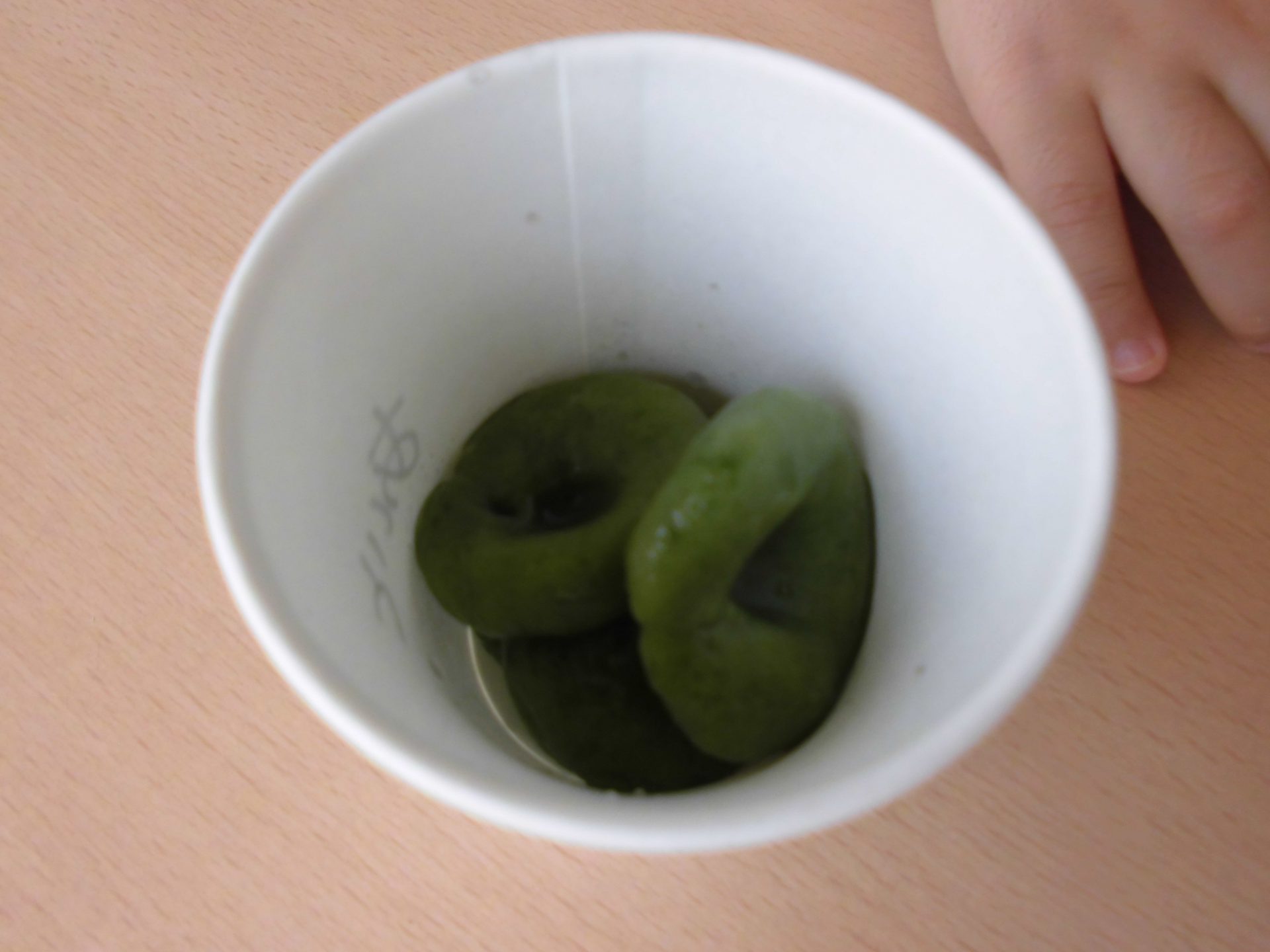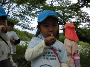 ・新芽と他の葉の色が違うことに気付く。『上の方は少し黄緑色してる!』『下はもっと緑だね』