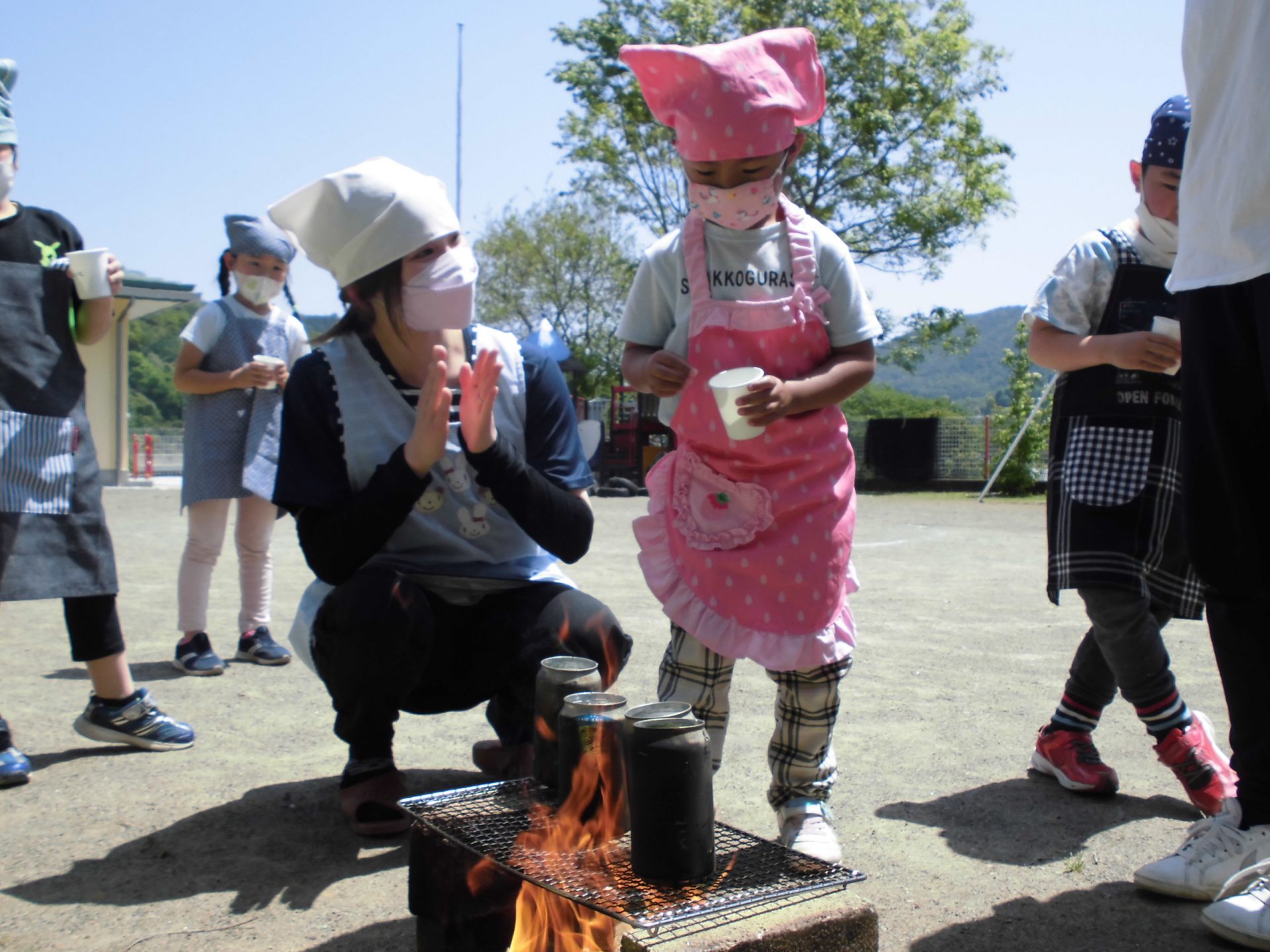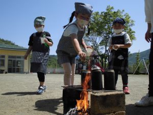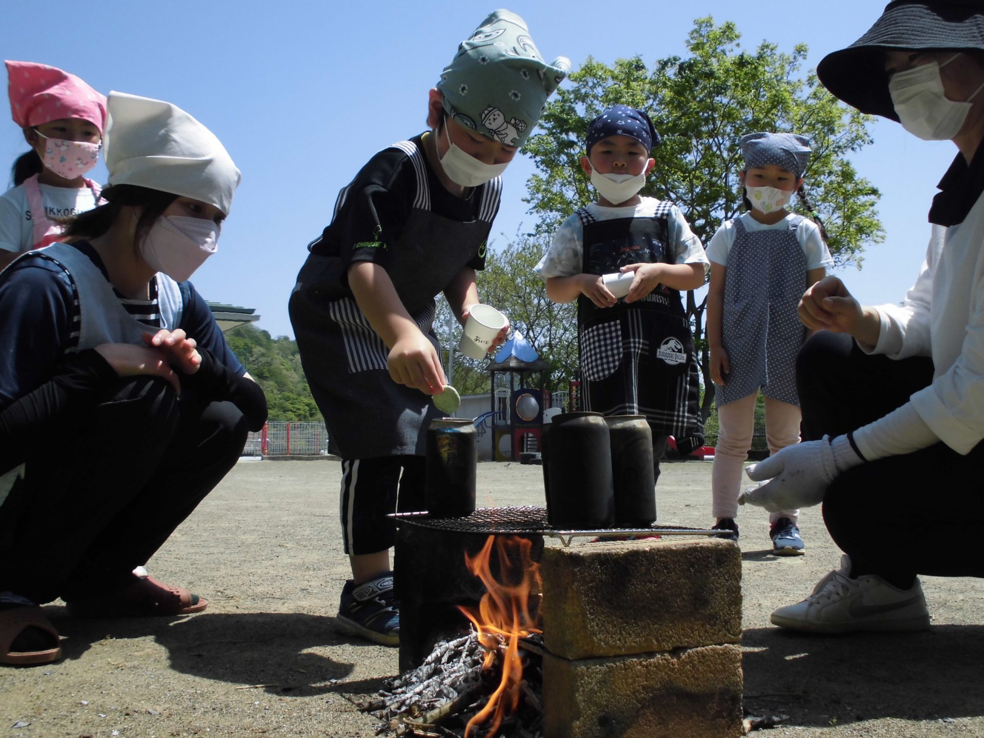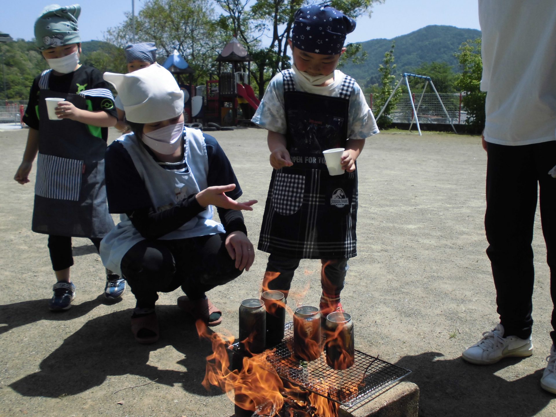 年長さんは、お湯の沸いている缶に自分で入れてみました!ドキドキ…
