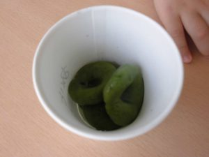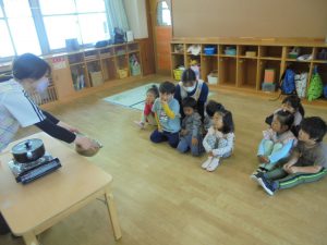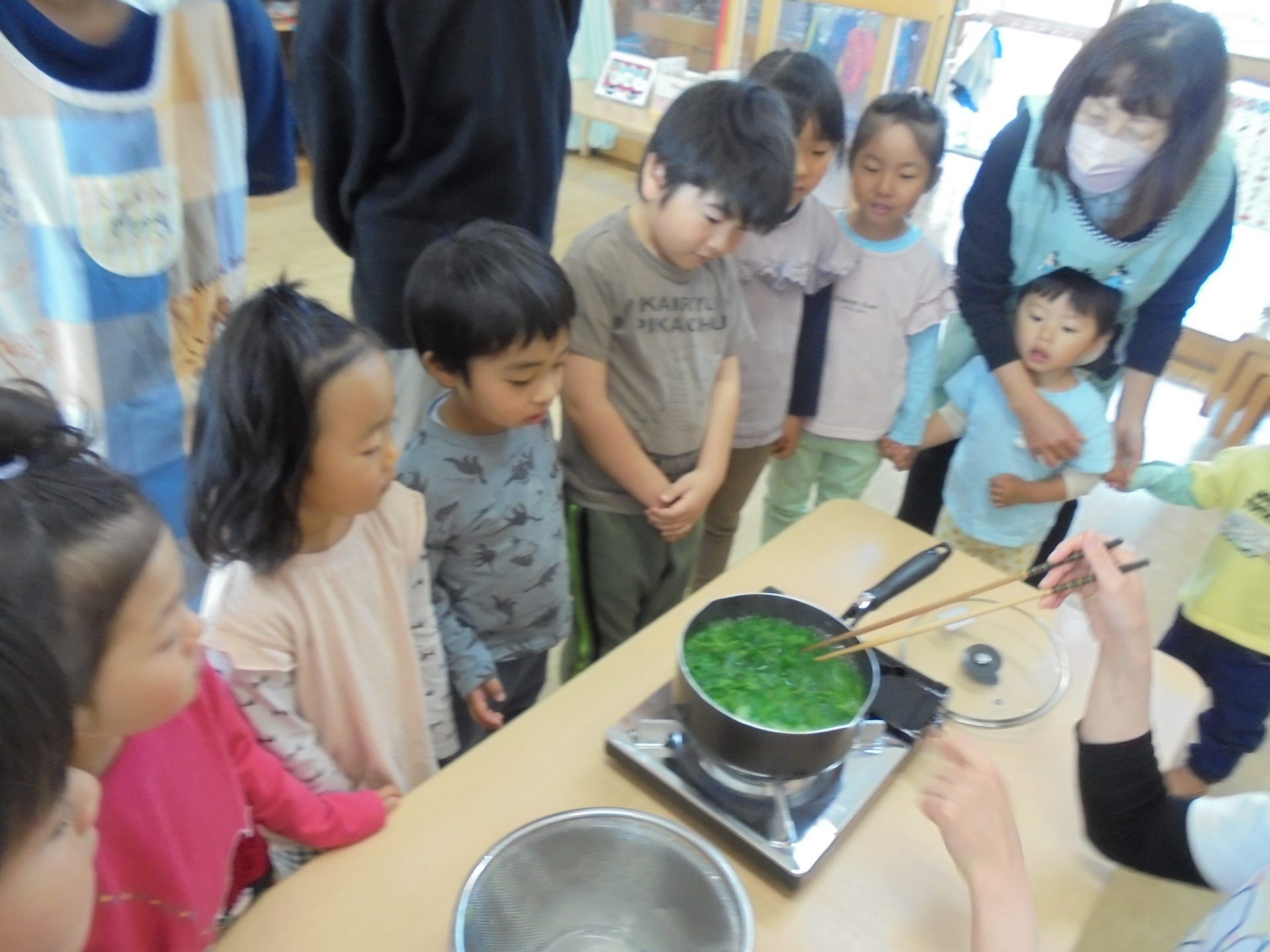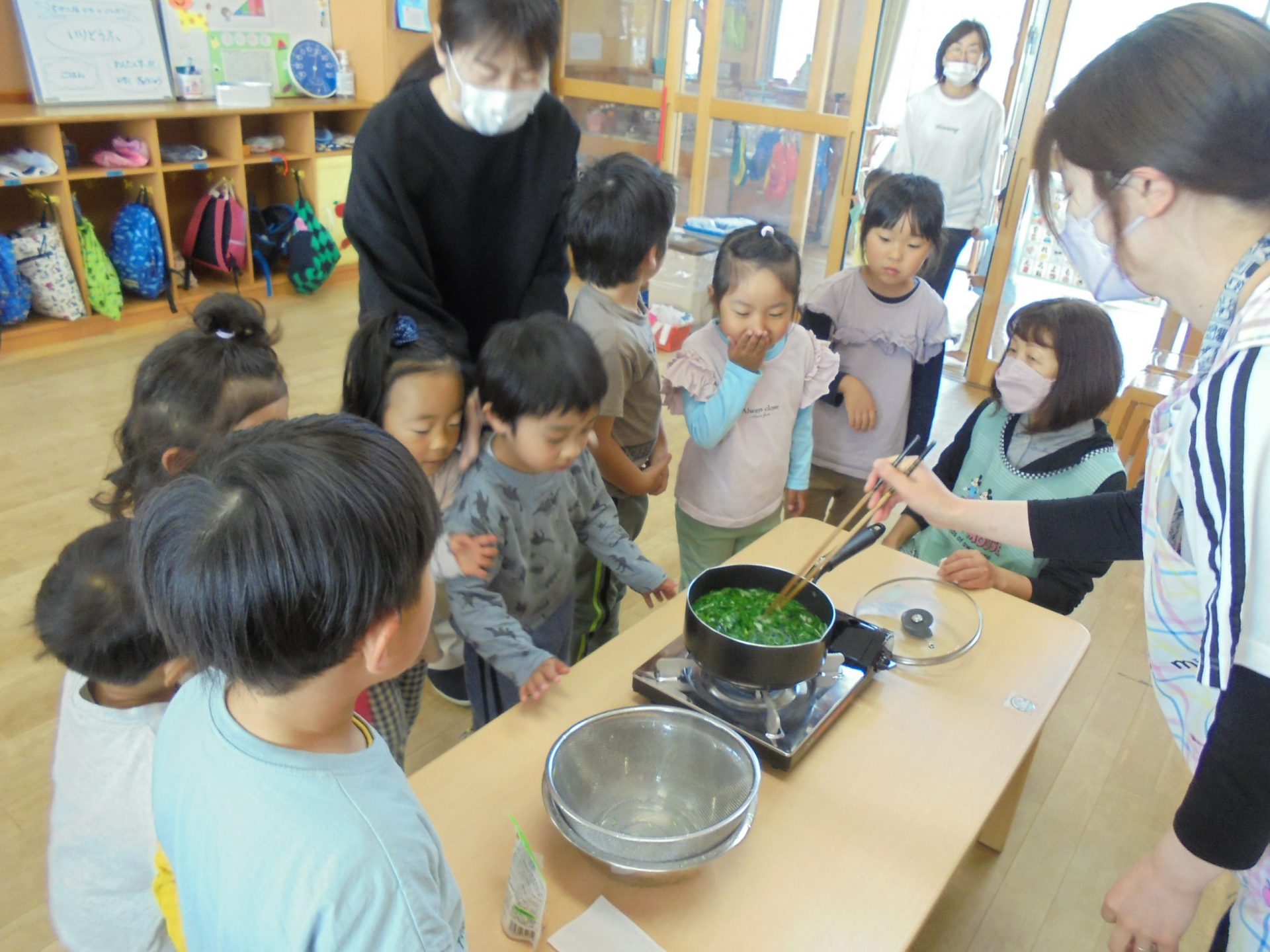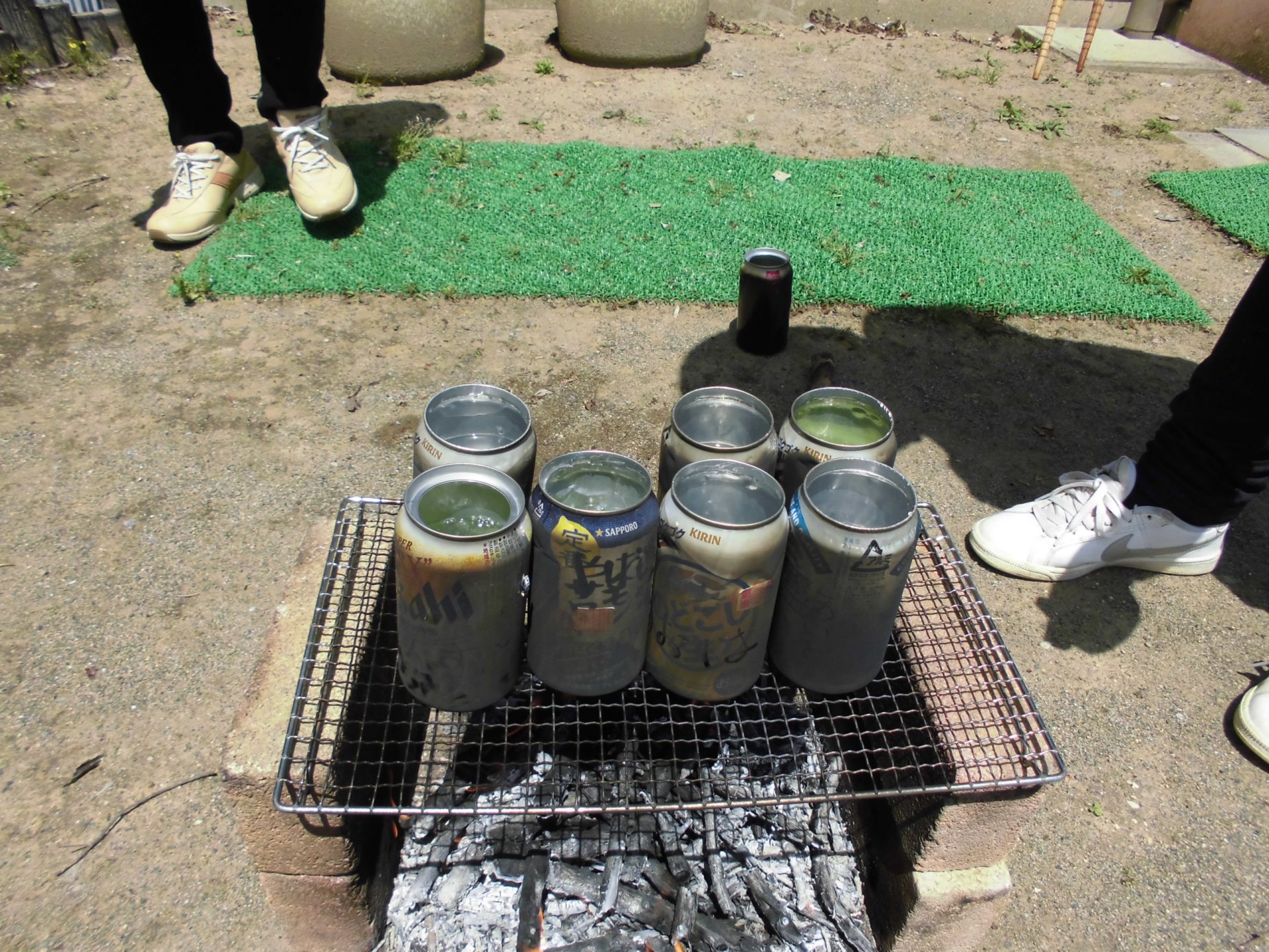 年長さんは、お湯の沸いている缶に自分で入れてみました!ドキドキ…