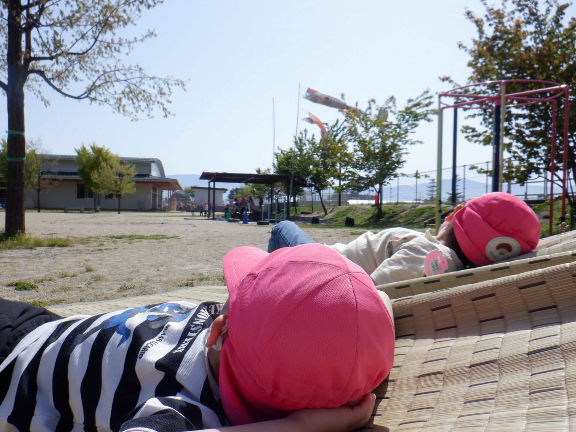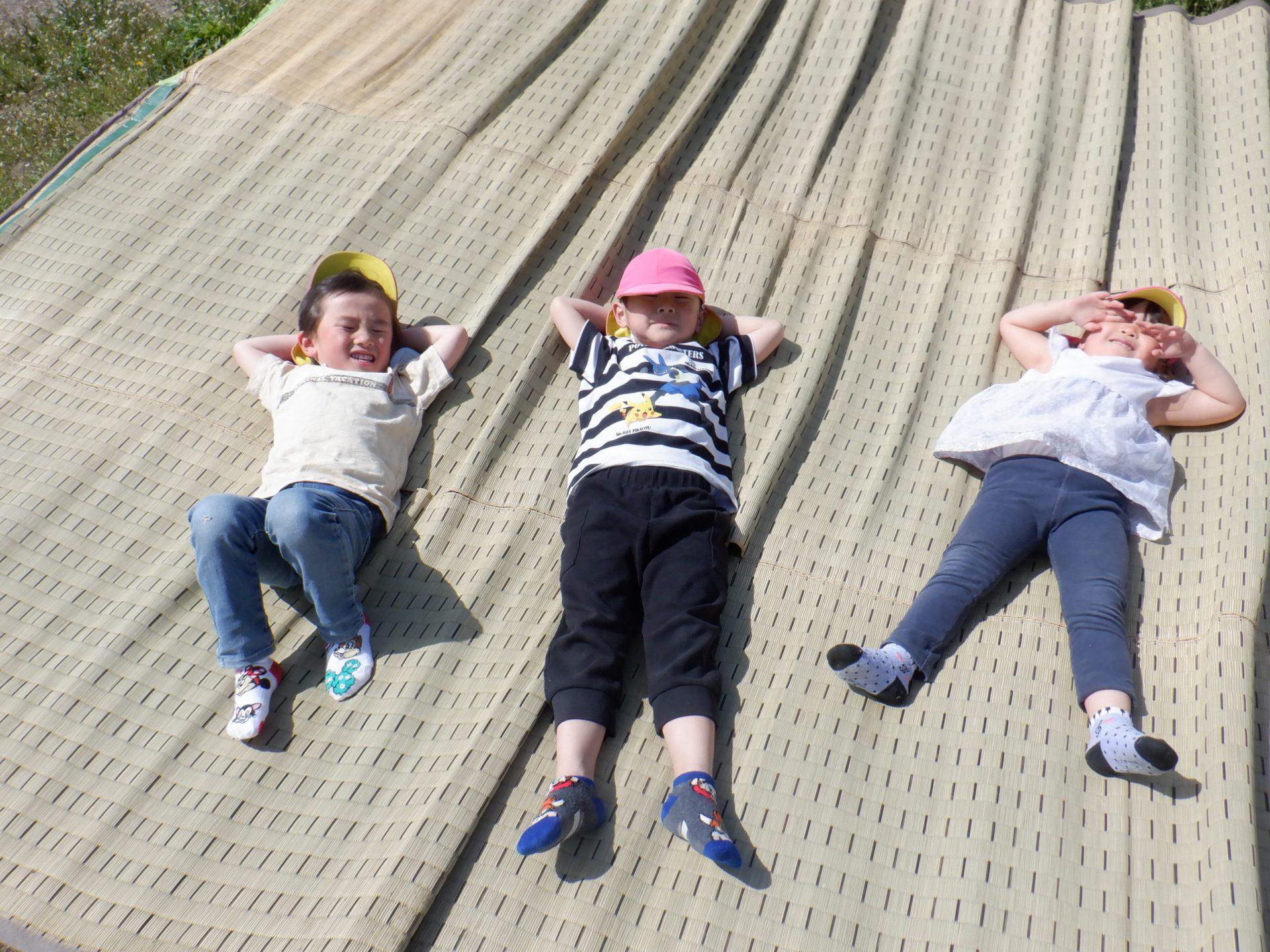 「良いこと考えた!」と、園庭の築山の下あたりにござを敷き始めました。