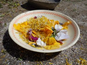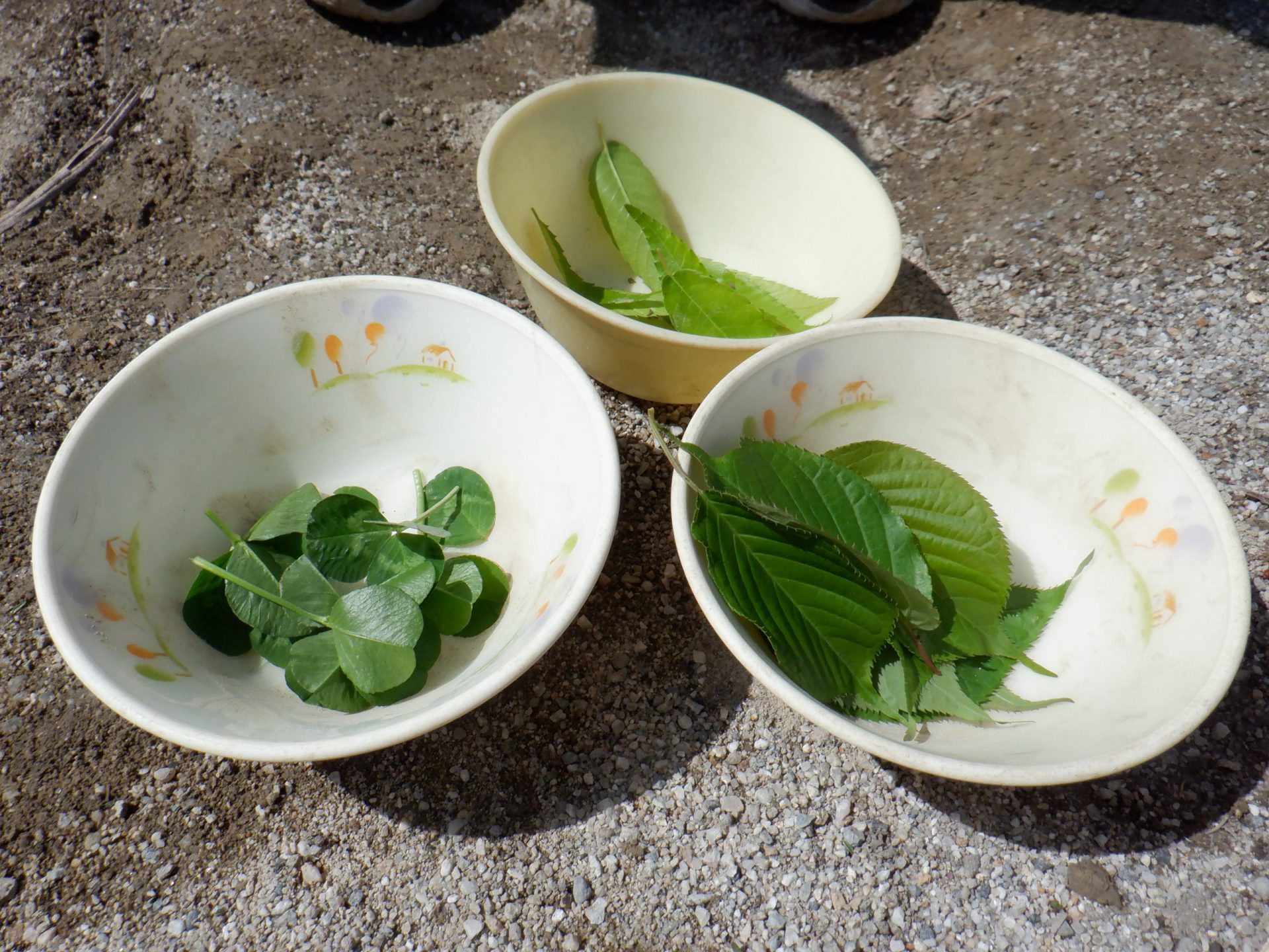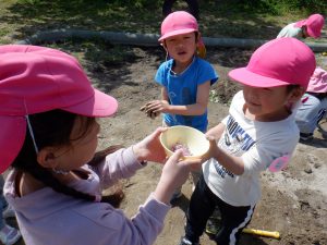 園庭にある自然物を使って、友達と一緒に、水を持ってくる人、葉っぱを持ってくる人、など役割を決めながら楽しんでいました。