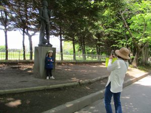 「あった、あったー!」鶏を抱いた銅像を発見しました。