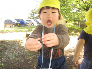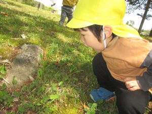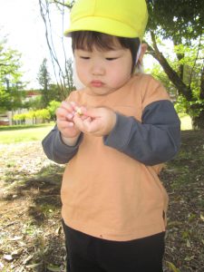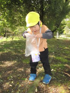 天気の良い日には園近くの広場に出かけ自然物を見つけて楽しく遊びます。