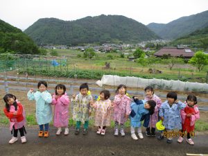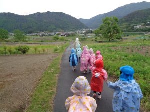 楽しみにしていた遠足が雨降りになってしまった。「残念」と思う子もいたかもしれないが、雨の中だからこその楽しみを探しながら遠足に出かけ、子ども達の喜ぶ姿を見ることができた。