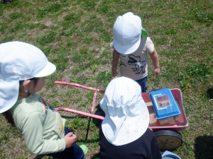 「モンシロチョウかな!!」と分かり、みんなであおむしくんの葉っぱ探しが始まりました。