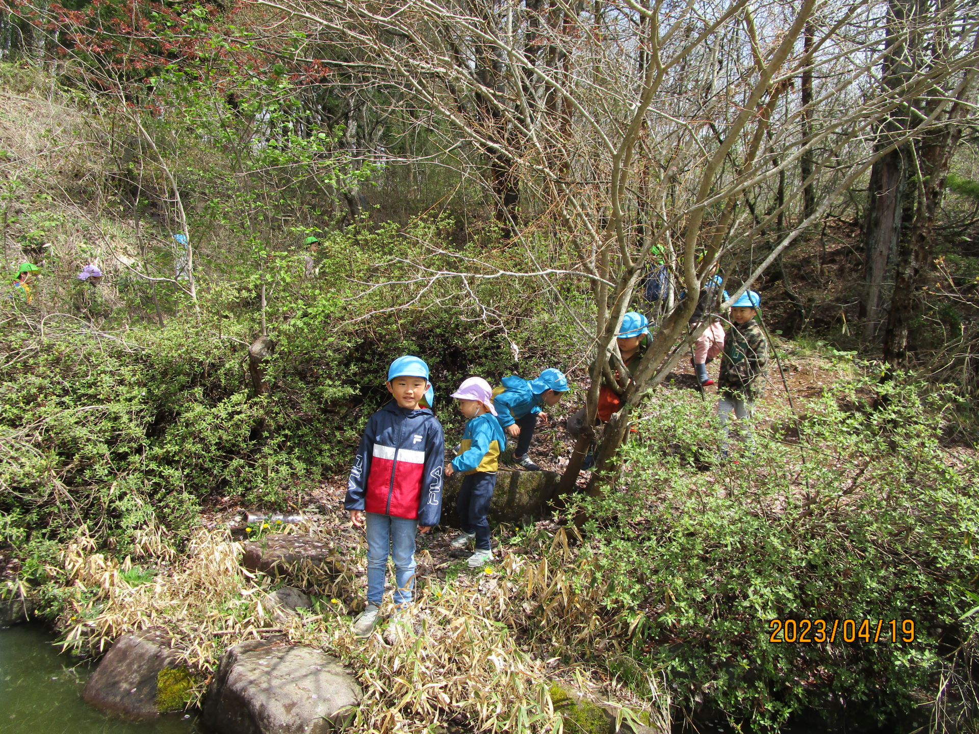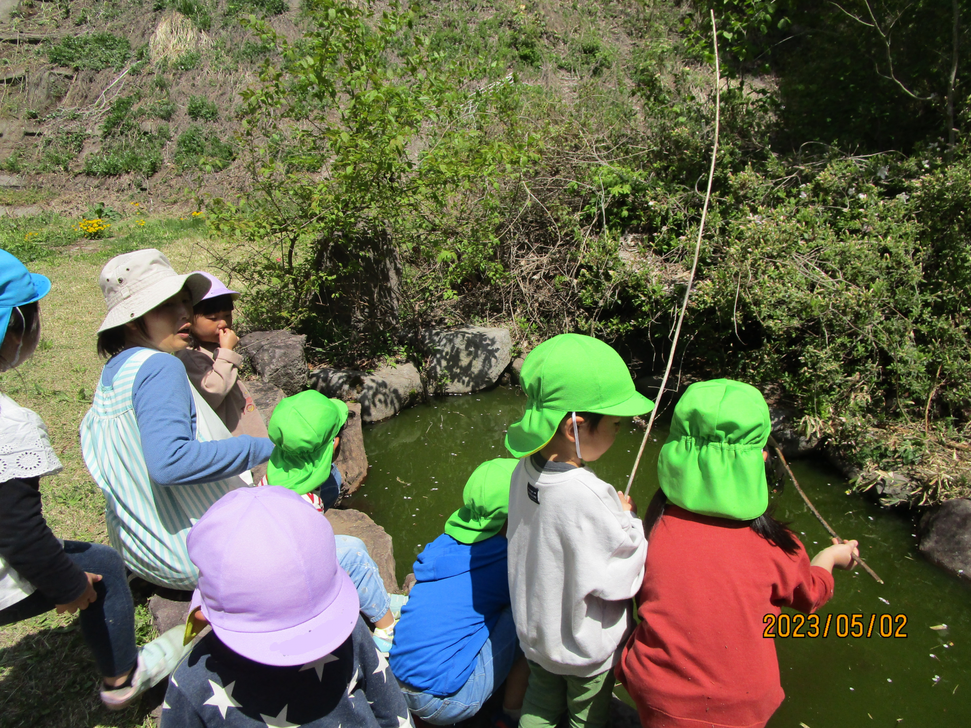 「なにこれぇーー!??」蛇のようなカエルの卵がありました!こんな立派な卵が見られるなんて、これも自然に囲まれているからこそですね♪カエルの卵に興味津々な子どもたちでしたが、「かわいそうだから。」と、最後はやさしくちゃんと池にかえしてあげていました。これで元気なオタマジャクシさんにも会えそうだね!