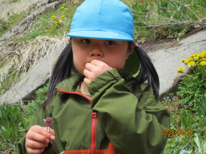 「この花吸うと甘い蜜がでてくるんだよ!おいしい!」と年長の女の子。