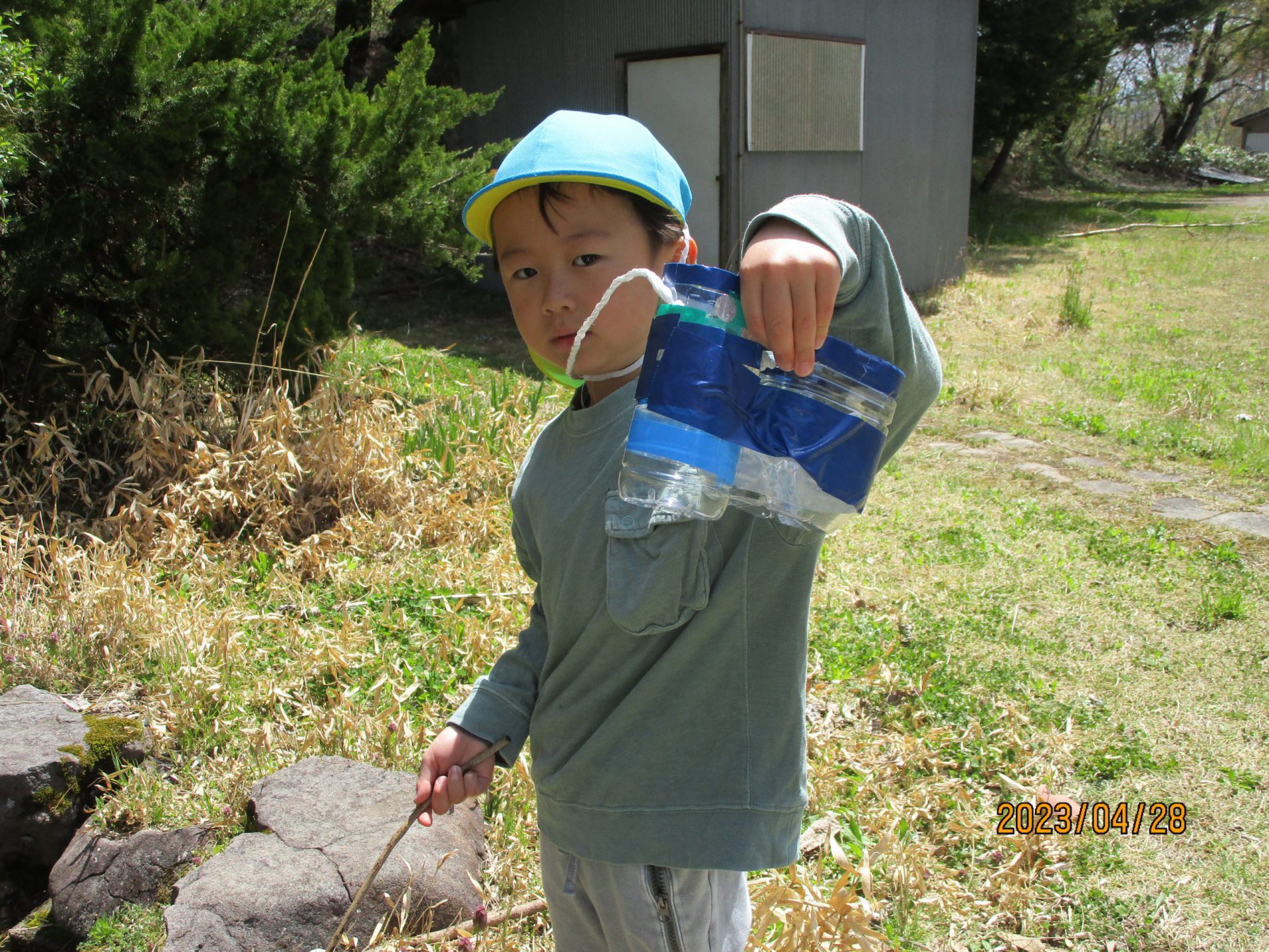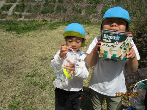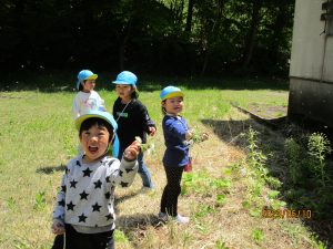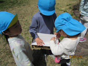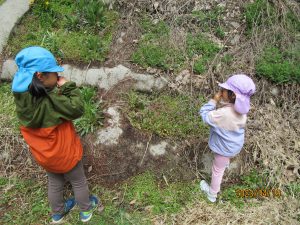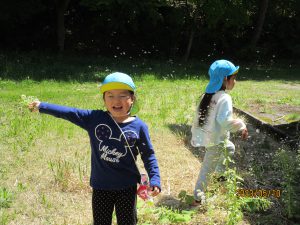 「みんな見てー!カナヘビ捕まえた!!」と男の子。その声に「見せてー!」とお友だちも集まってきました。大好きなカナヘビを捕まえることができご満悦♪お散歩バッグがあるからカナヘビだって連れて帰ることができます♪うまくお散歩バッグを活用する子どもたちです。