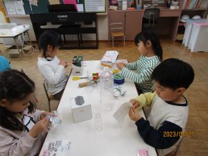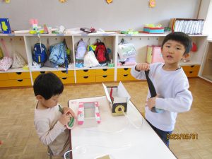 そしてなかには「次はここをこうしたい」と、さらに次の改良へ期待を膨らませる子もいます。こうして、困ったことも自分なりに考え工夫して乗り越え、その乗り越えられた経験がまた自信に繋がりさらなる挑戦への意欲になっていくのだと改めて感じさせられました。子どもたちをすぐに正解へと導くのをぐっと堪え、子ども自身の気づき、工夫、経験から得られるものをこれからも大事にしていきたいです。あじさい組の一年はまだまだ始まったばかり。これからどんな出会いや気づき、学びが待っているのかな?保育士である私もとても楽しみです!子どもたちの発見に寄り添い、共感し、子どもたちの“やってみたい”を叶えてあげられる環境づくりを大切にしていきたいと思います!