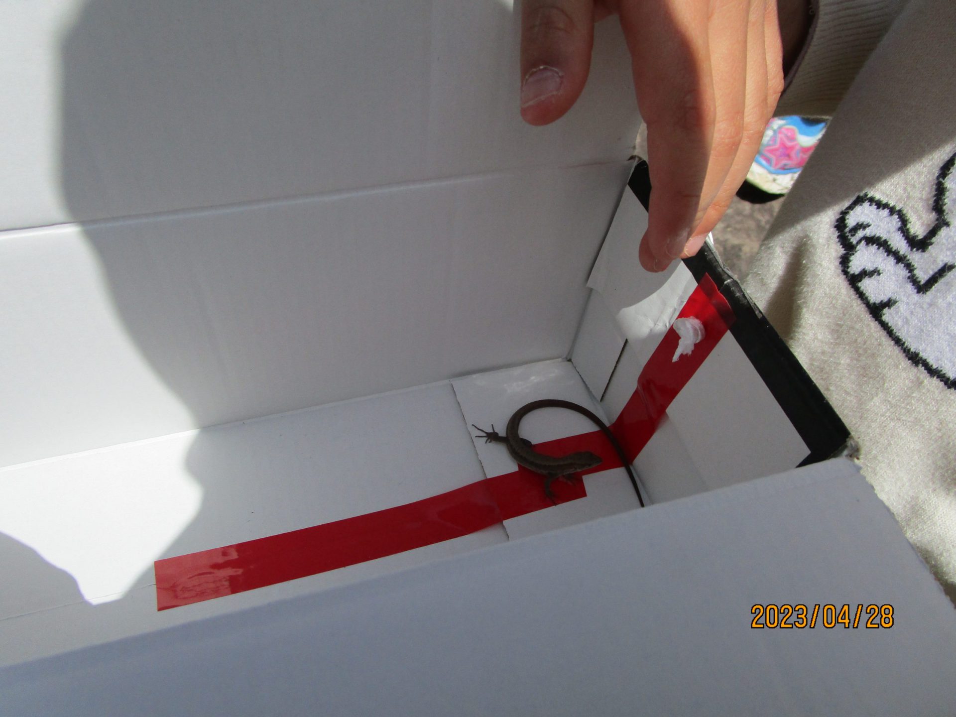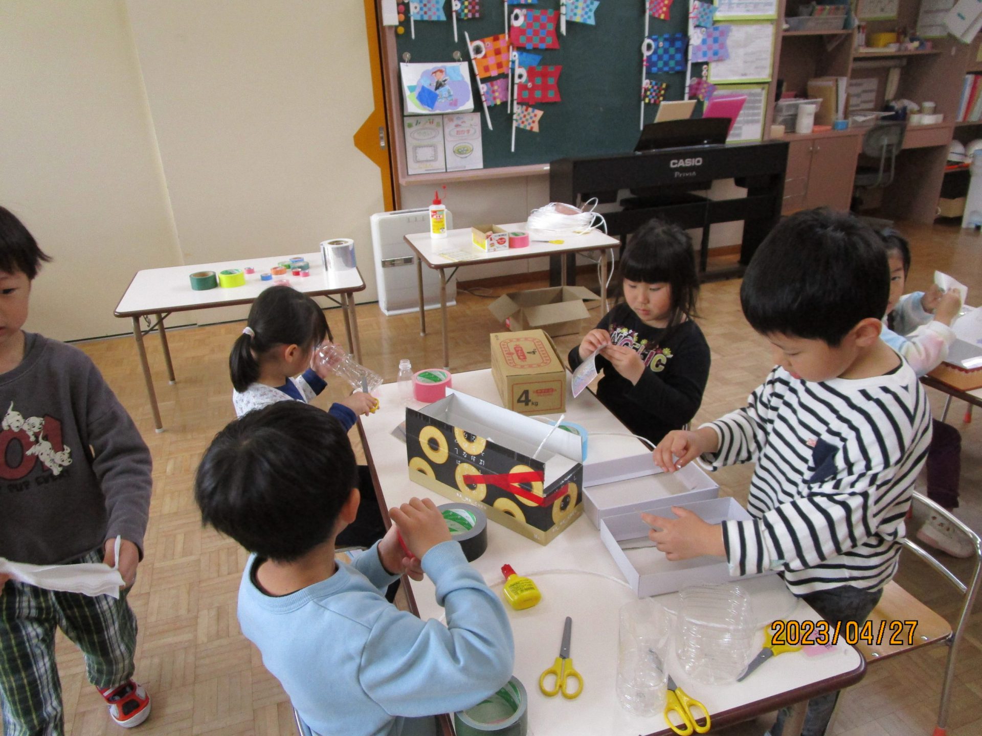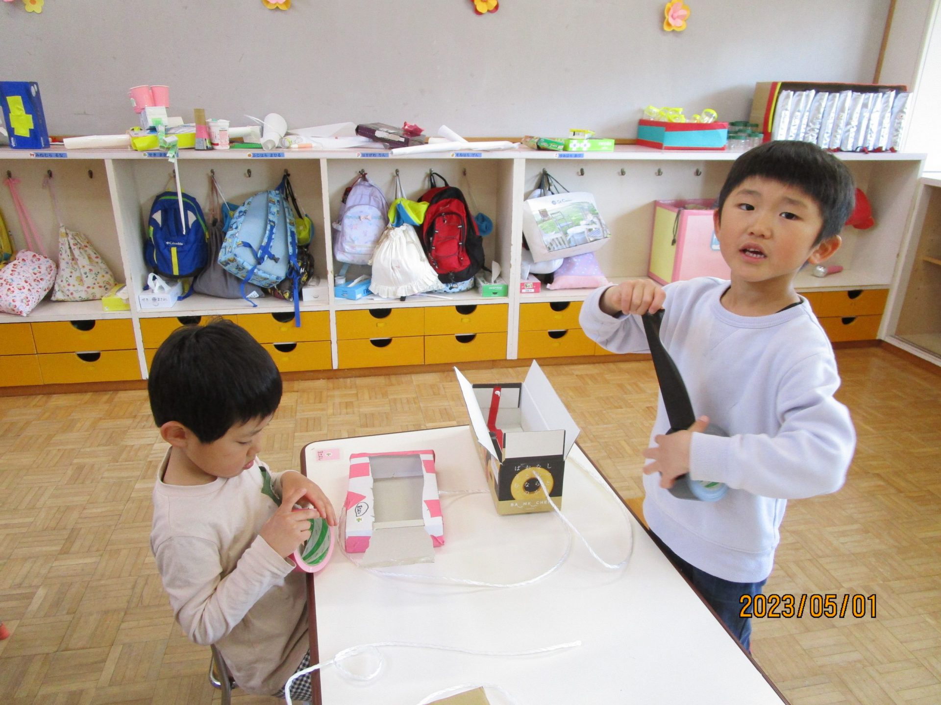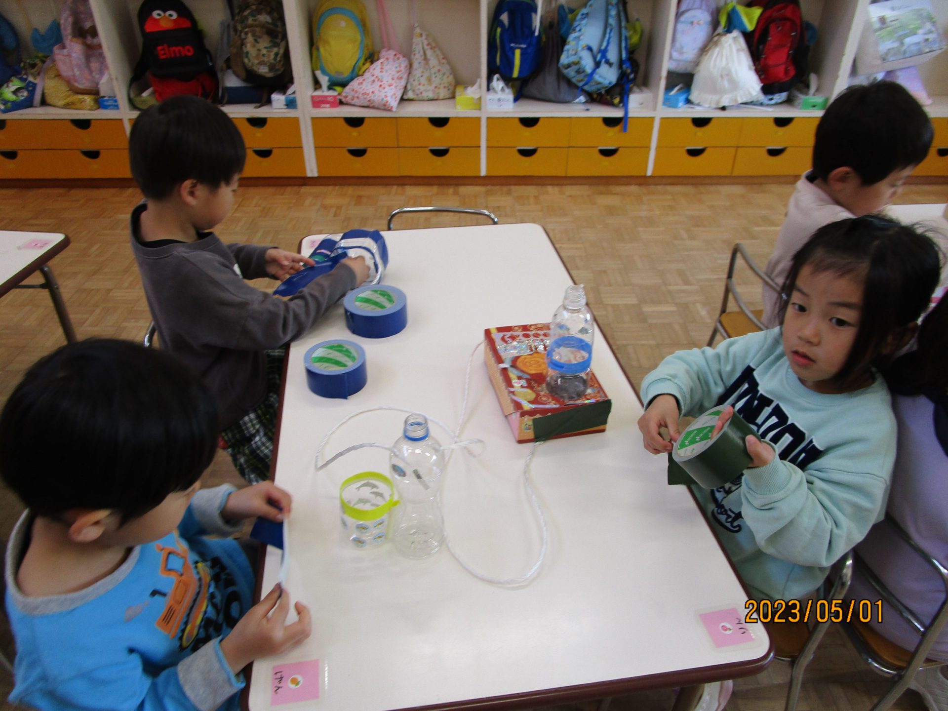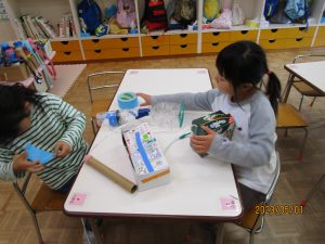 素材も一から自分で選びます。たくさん入れたいからと大きな箱にする子、オタマジャクシを入れたいからとペットボトルにする子、持ちやすいようにと小さめの箱を選ぶ子など本当に様々です。テープも色んなものを用意しておくとガムテープ、ビニールテープ、セロハンテープと一人ひとり選ぶものが異なる姿がありました。