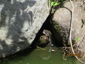 池のほうでは「うわあ!?」と子どもたちの大きな悲鳴が…!覗いてみると大きなカエルが!!カエルもまた、こちらを熱心に覗いていました。お互いにびっくりしたよね!