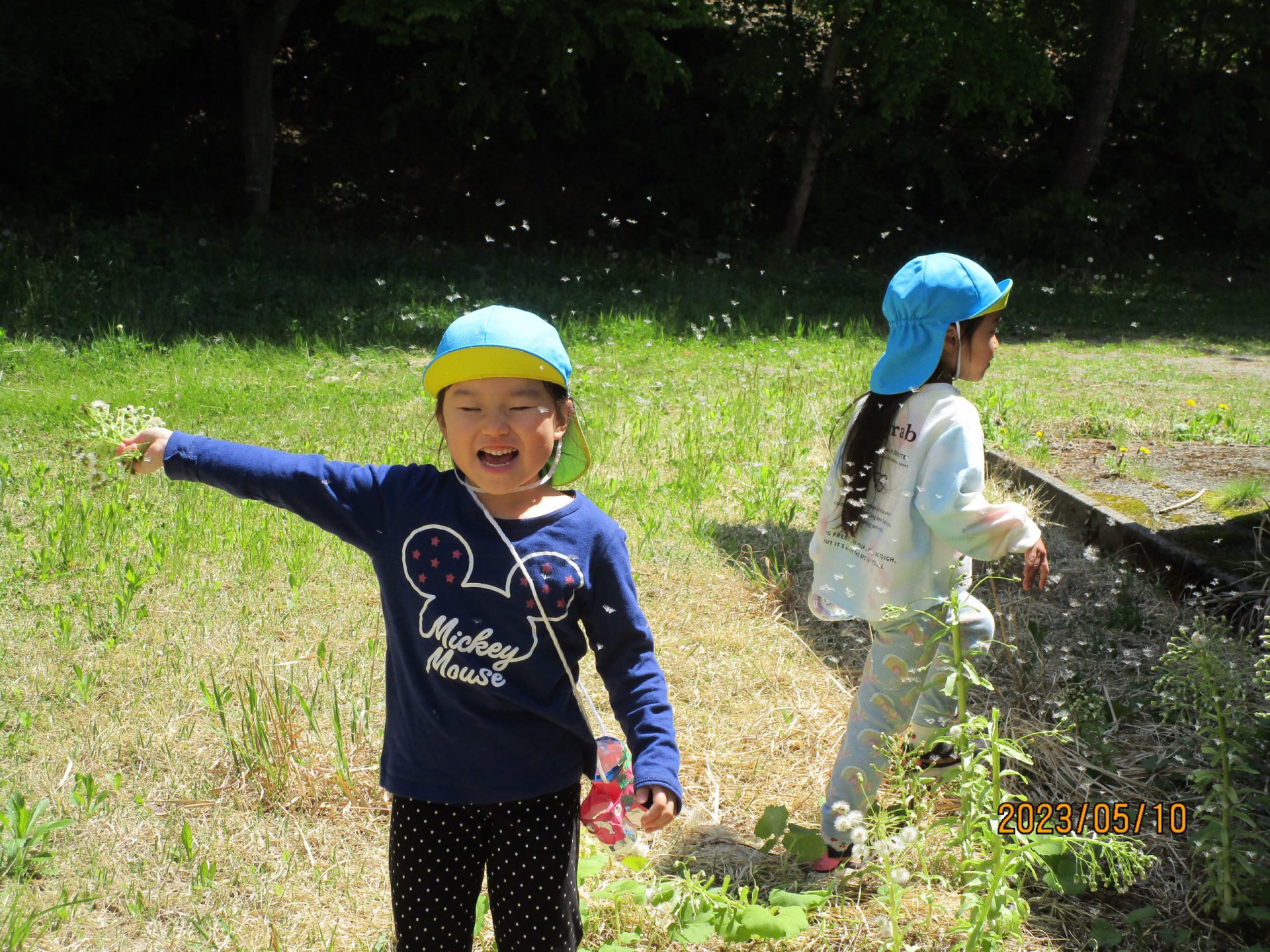 こちらは綿毛を見つけて大興奮!「ブンブン振るといっぱい綿毛飛ぶー!」ととっても嬉しそうです♪その声につられてお友だちが集まり、「ほんとだー!」と綿毛飛ばし仲間が増えていきました!