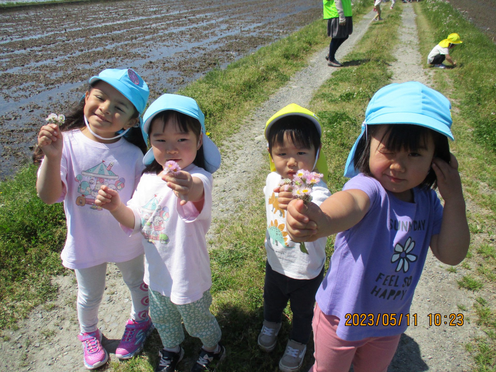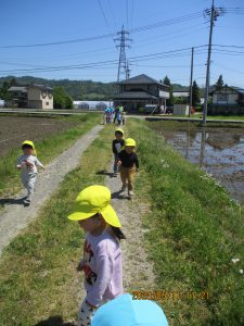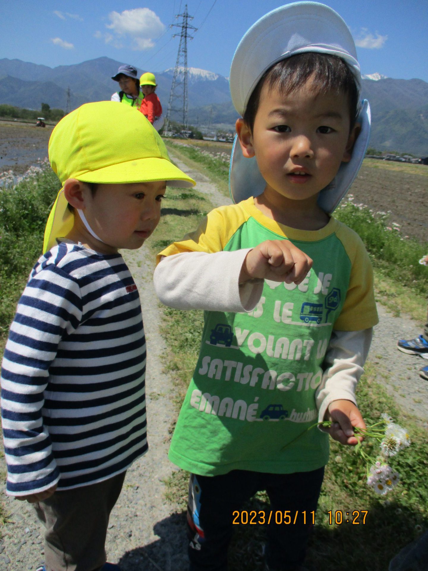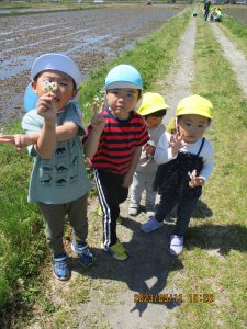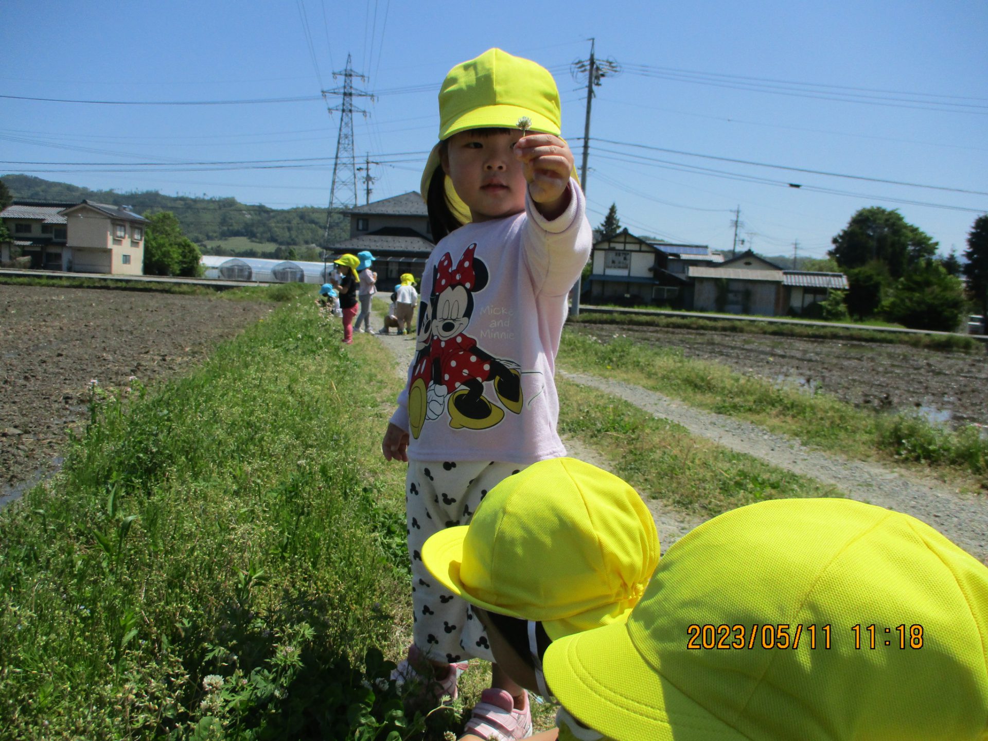 ぱんだ組(年中)に連れて行ってもらって、近くの田んぼ道へ出かけます。