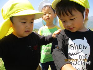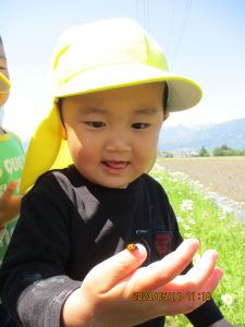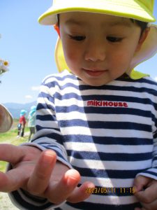 自然の中で、お兄ちゃん、お姉ちゃんが発見したことに刺激を受け、自ら進んで嬉しそうに虫を手にする姿も見られました。