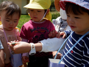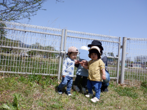 園舎裏の原っぱへカートに乗って散歩に出かけました。