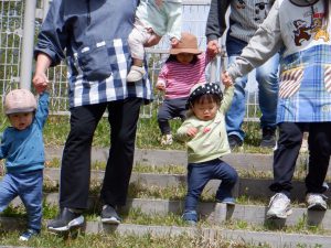 「上ってみようかな」ひとりの子が保育士と一緒に上り始めます。