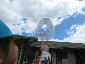 穴あきのペープサートを持って、園庭でワンピースの模様探しもしてみました♪