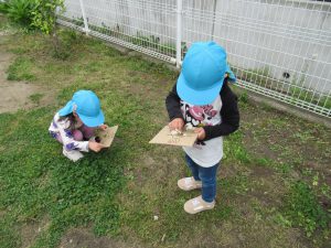 室内で探してみると、壁や本棚やカーペットの模様などにかざし、園庭では、花壇やクローバー、空や雲などにかざして様々な模様を発見していました!