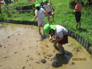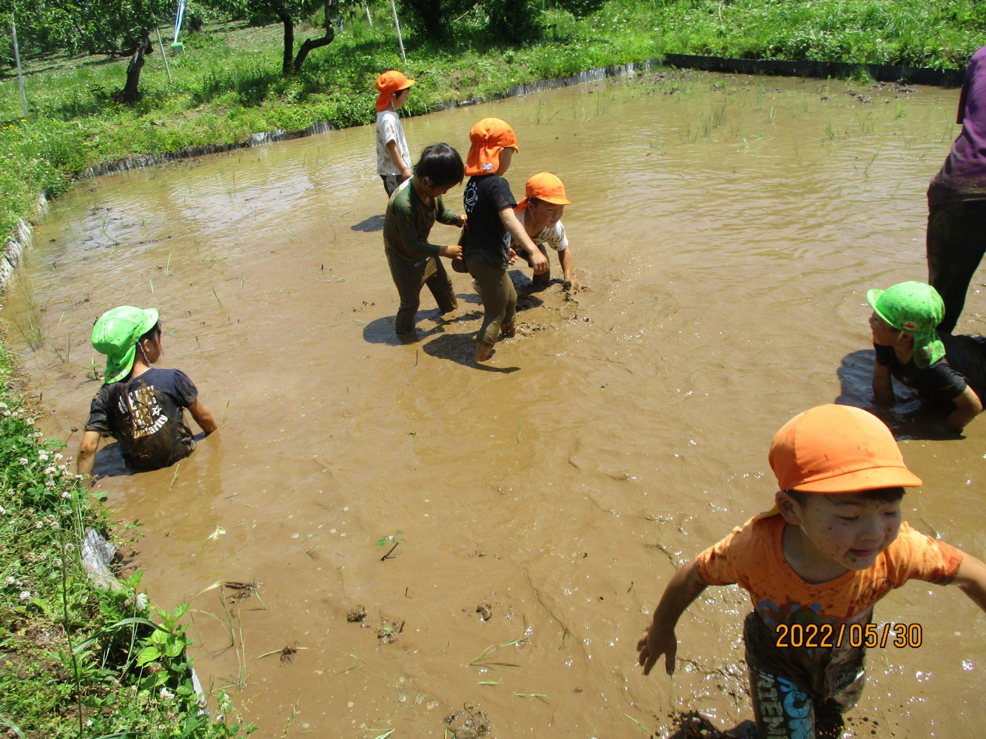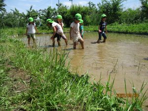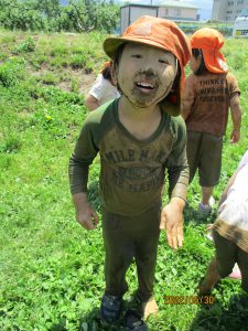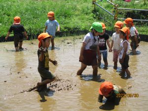 小学校で田植えをする前に、保育園の子どもたちは代搔きがわりに泥んこ遊びを行っています。