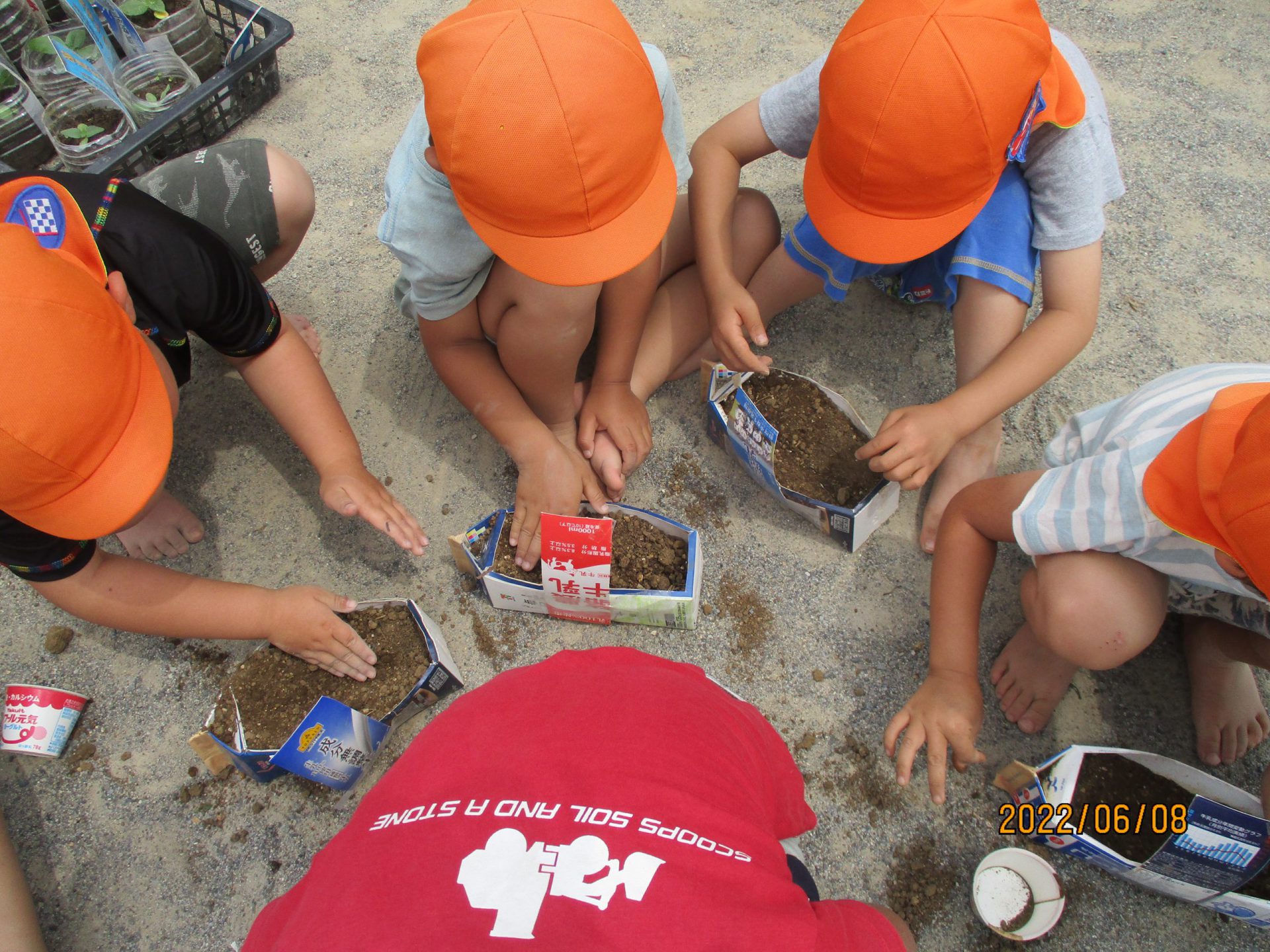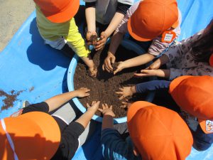 保育園でも種をまきたい!と、いずみの里からもらってきた土をたい肥とまぜまぜ~