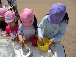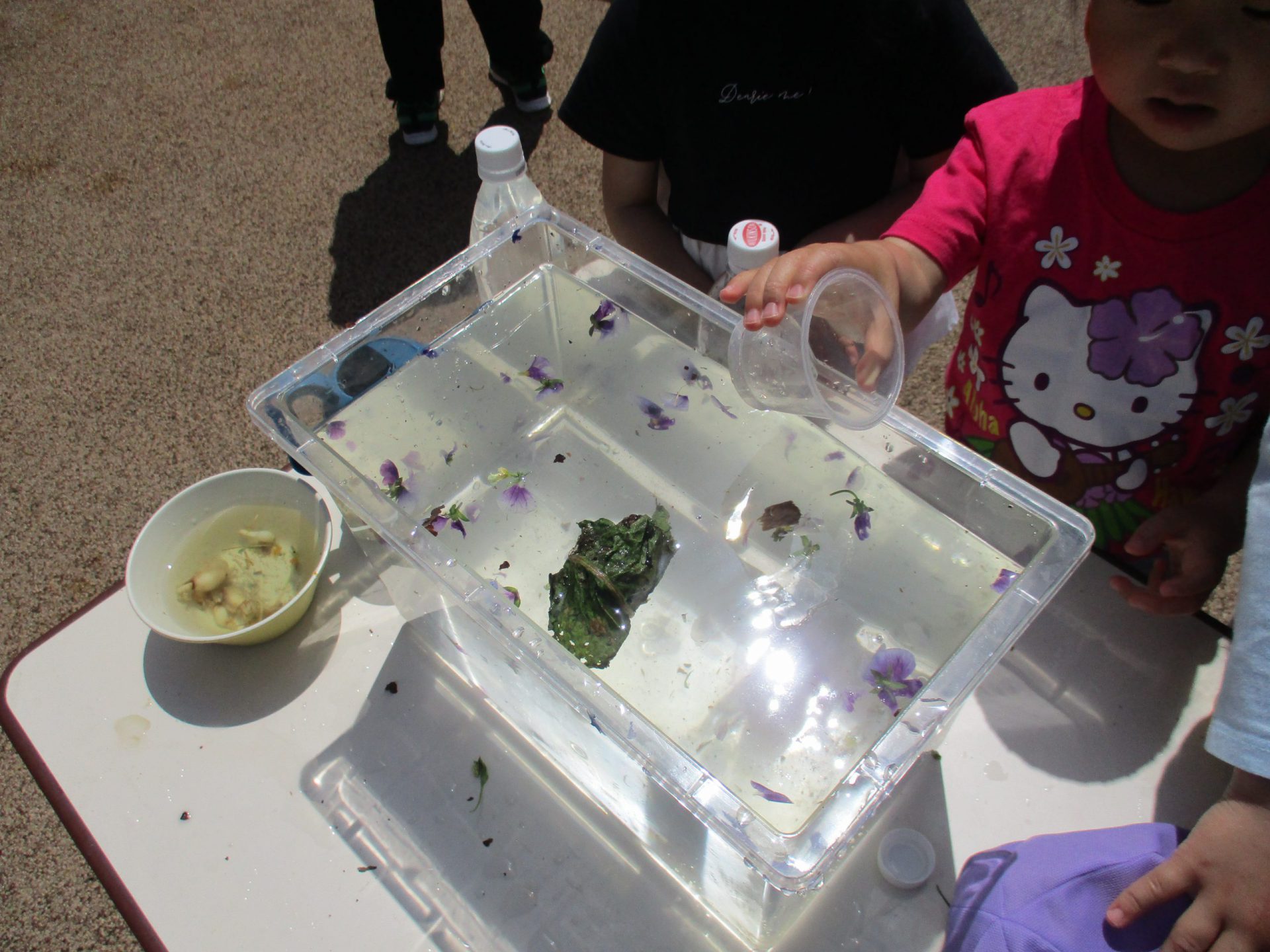 こちらでは、水の中に草花を入れて夢中になってお料理をしています。