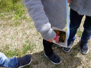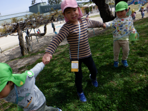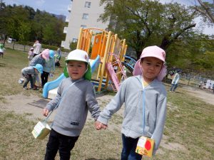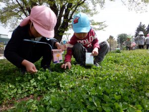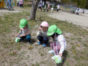 「タンポポあったよ!」「良い枝あるよ!」沢山宝を見つけました。