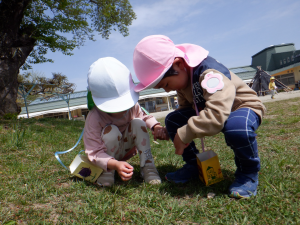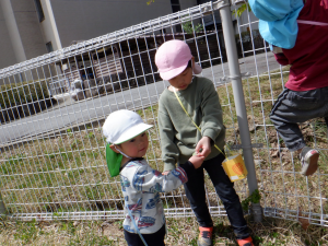 みんなが大好きな遊び場の園庭、そこで見つかる宝物(虫、草花)を教えてあげようと、”森の探検”を計画し、話し合ってきました。