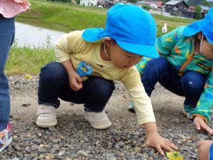 石ころ「ツルツルだね。こっちはゴツゴツしてる。」保育士が石の感触を伝えます。