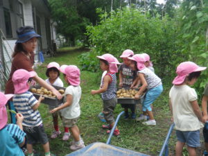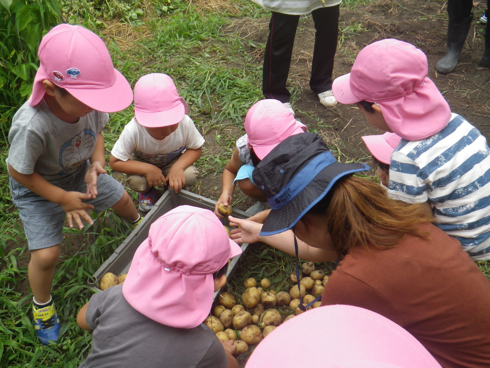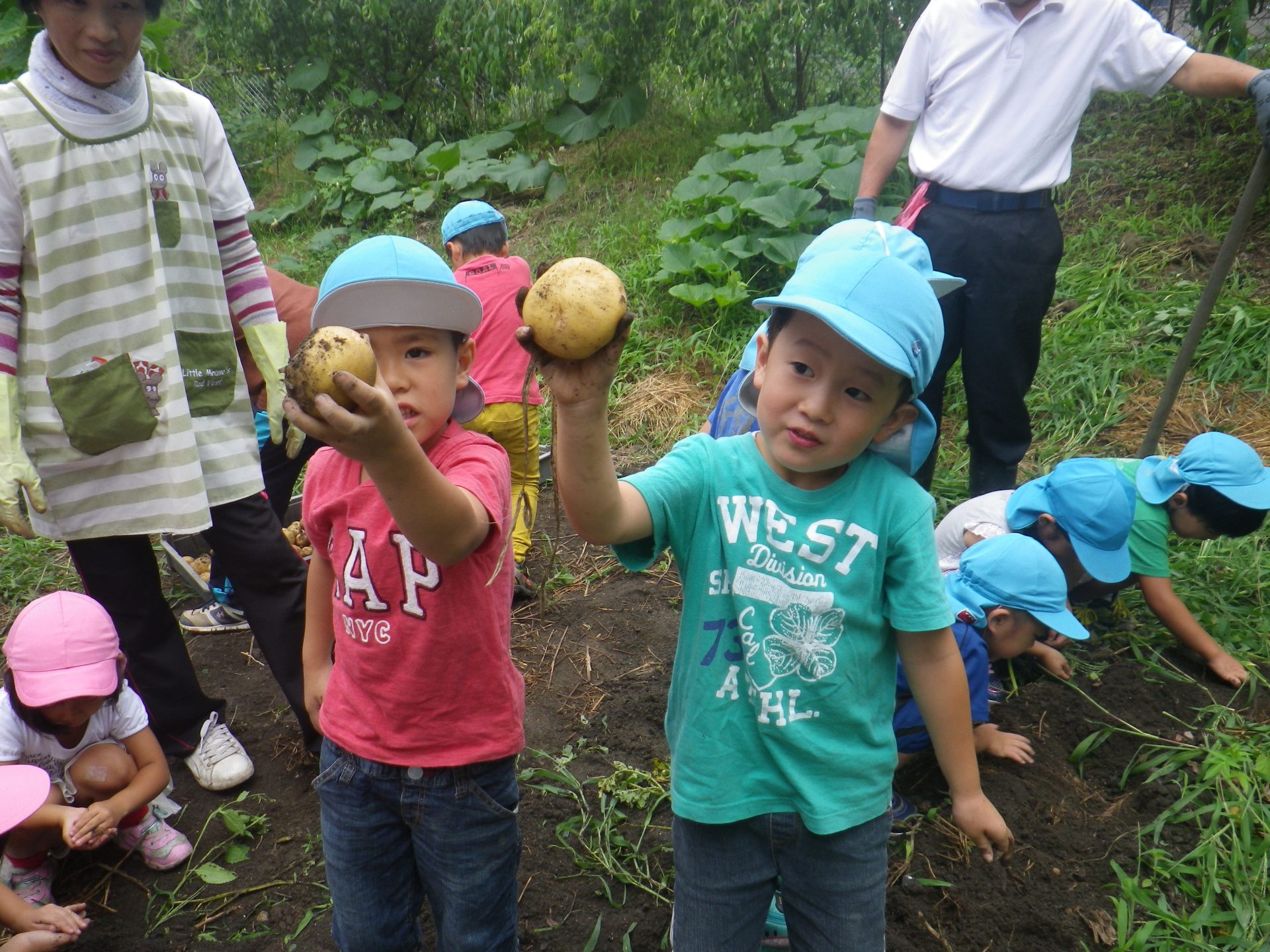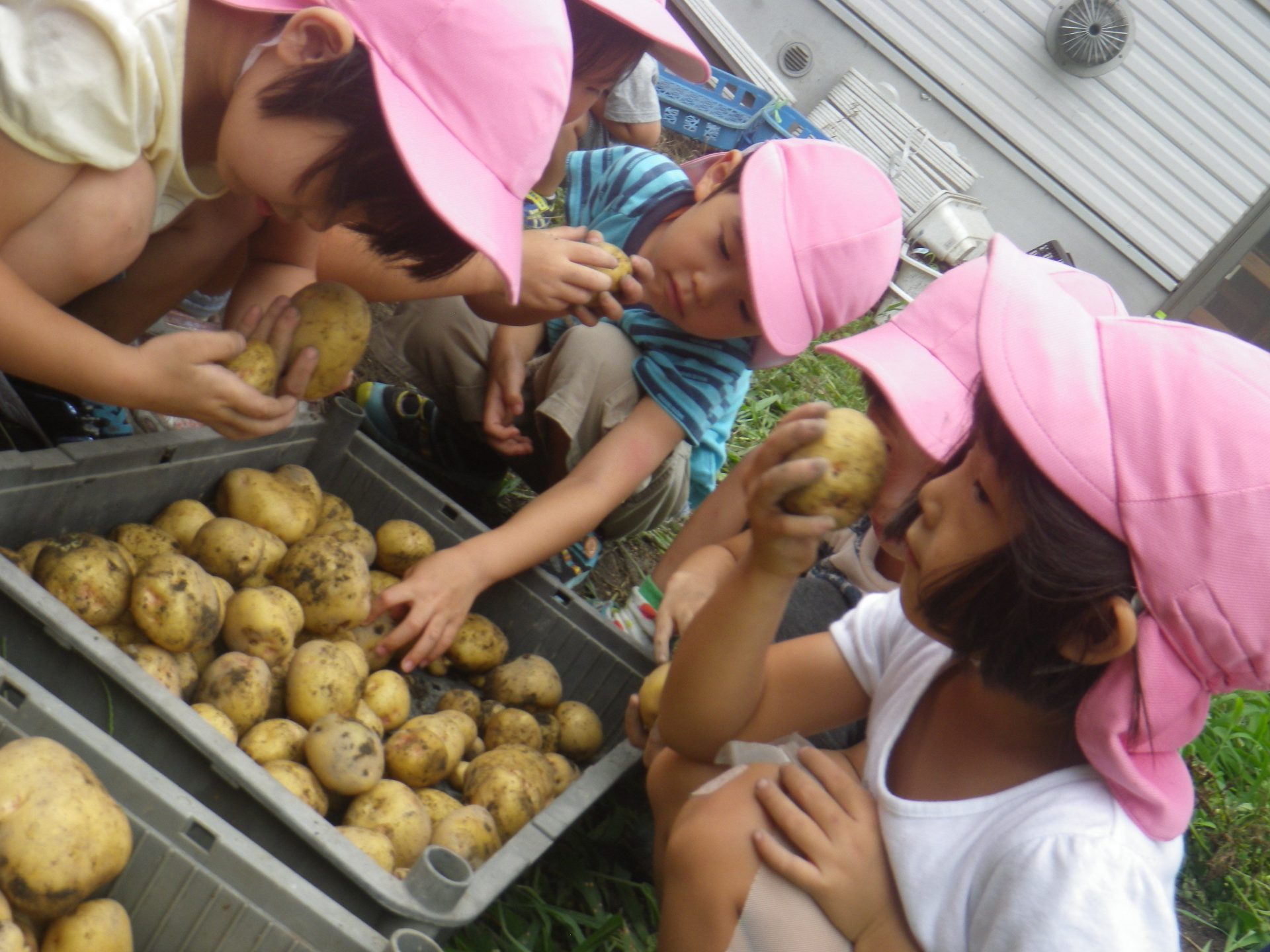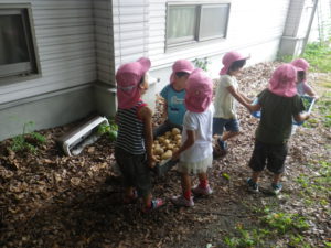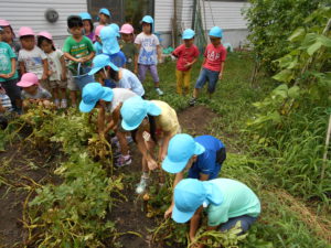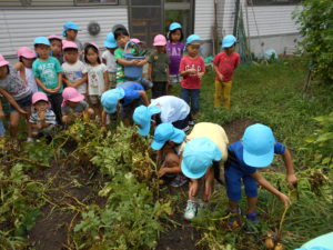 ・この日の主な活動は、ジャガイモ堀り。土に触り土の中の見えないジャガイモを探す楽しさに触れたり、お友達とかかわりながら掘ったりしてほしいと思っていました。そんな担任たちの思いや願いを超え、担任の「ここ掘れわんわん」「お宝まだ、あるかな?」「まだ、かくれんぼしてるかな?」の声掛けに合わせるかのように、子どもたちからも「ここ掘れわんわん」「お宝あるかな?」などど言いながら、友達と一緒にジャガイモ堀りを夢中になって楽しむ姿がありうれしくなりました。