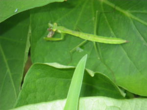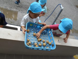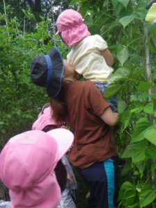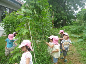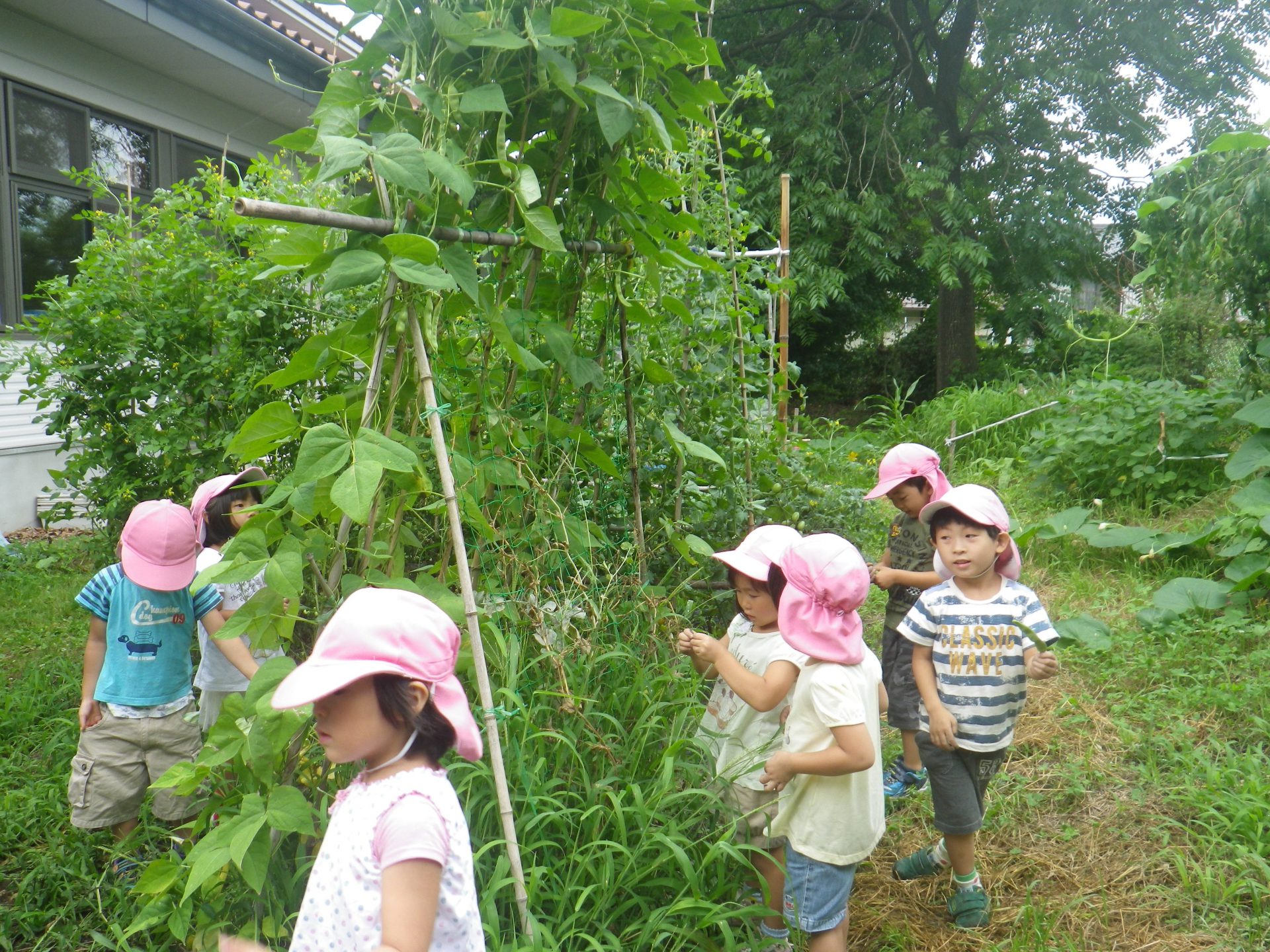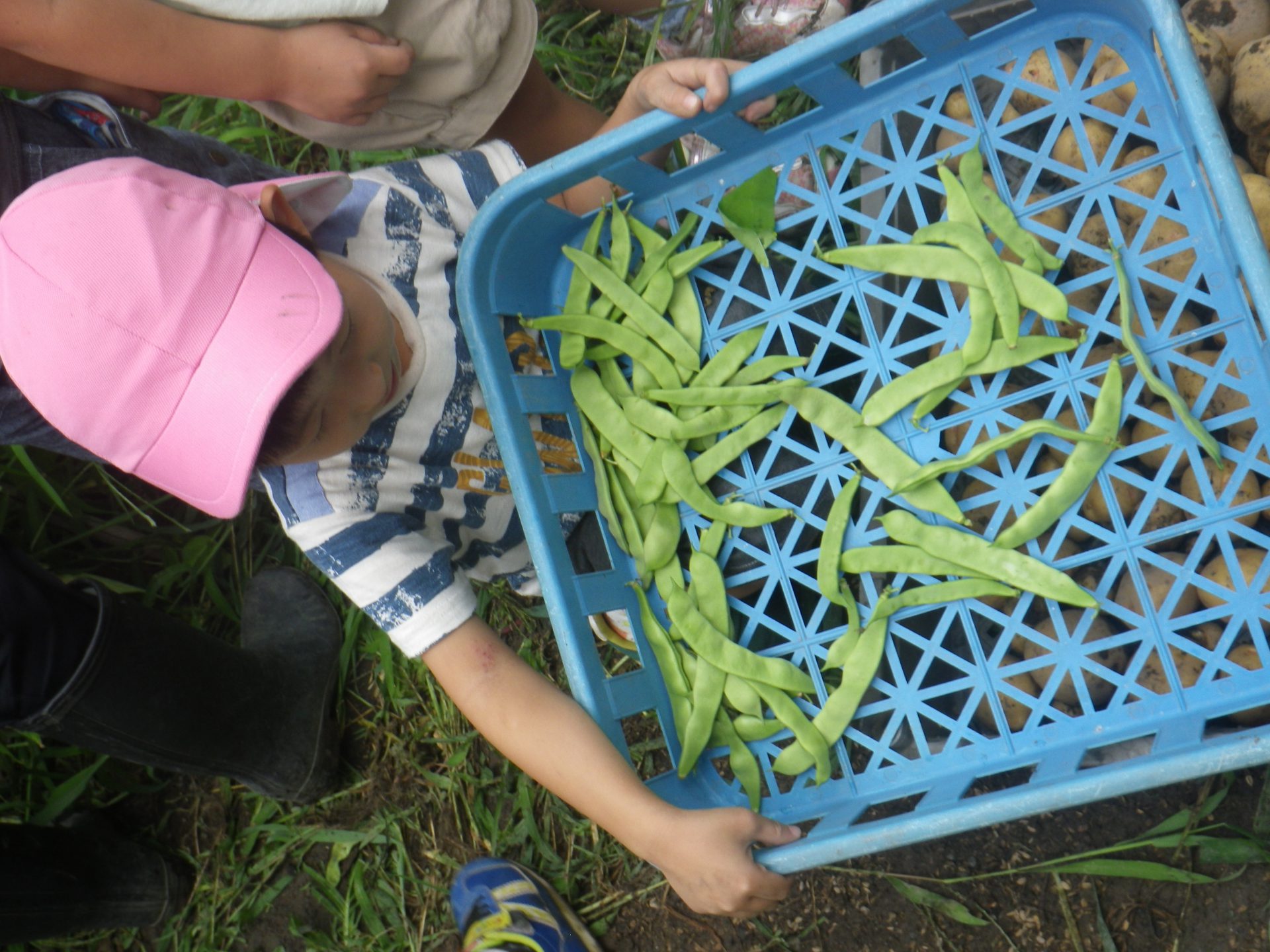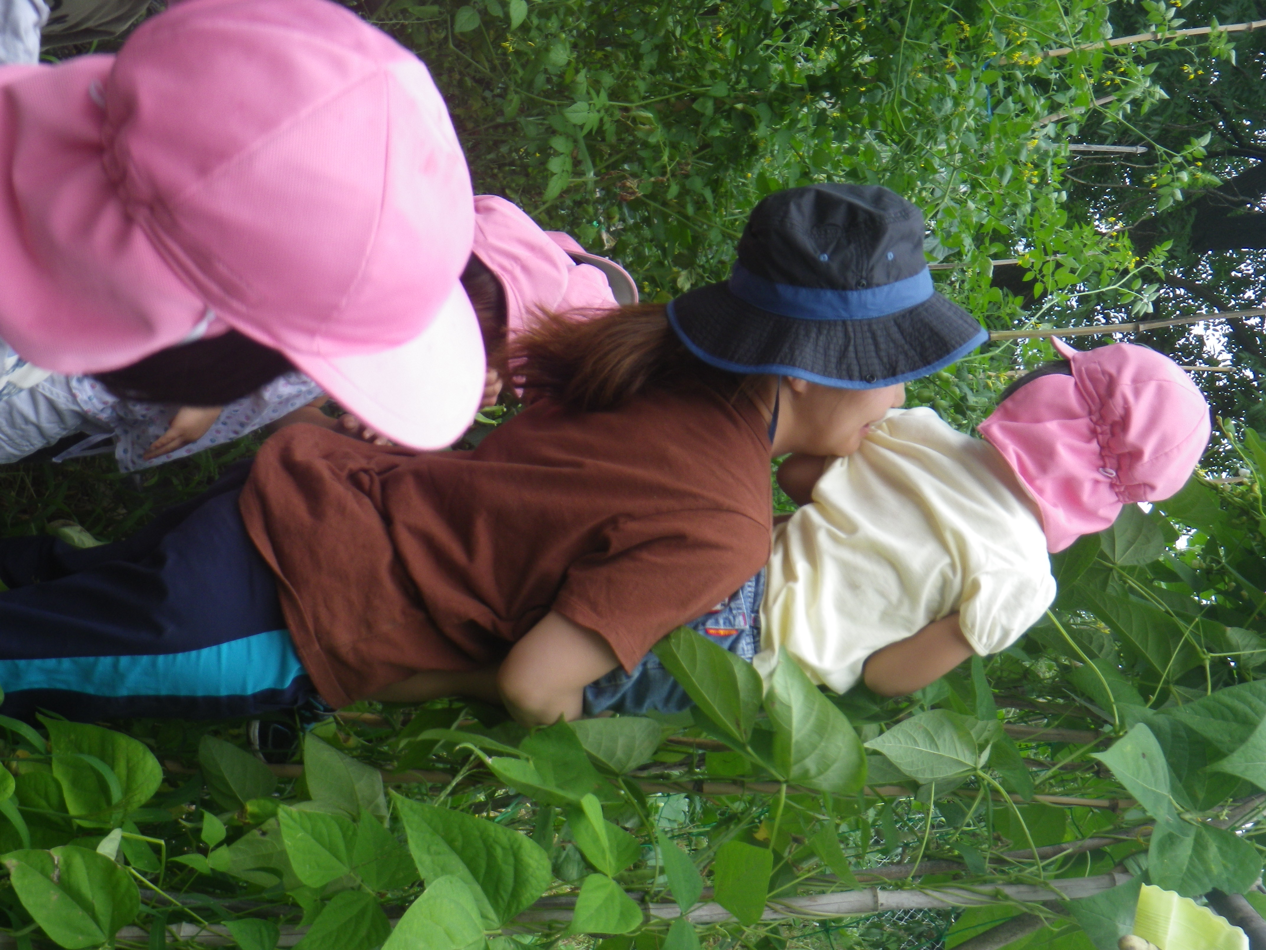 ・モロッコいんげん採りは、いんげんを見つける楽しさ、収穫してよい長さなのか見極めようとする姿は、日ごろからありました。この日は、何度も抱っこをせがまれた担任が、笑いながら「もう勘弁して。」と口にしたのをちゃんと聞いており、抱っこしていんげん採りをさせている担任のお尻を持ち上げてくれるそんな優しさに触れ、うれしいやらびっくりするやらでした。