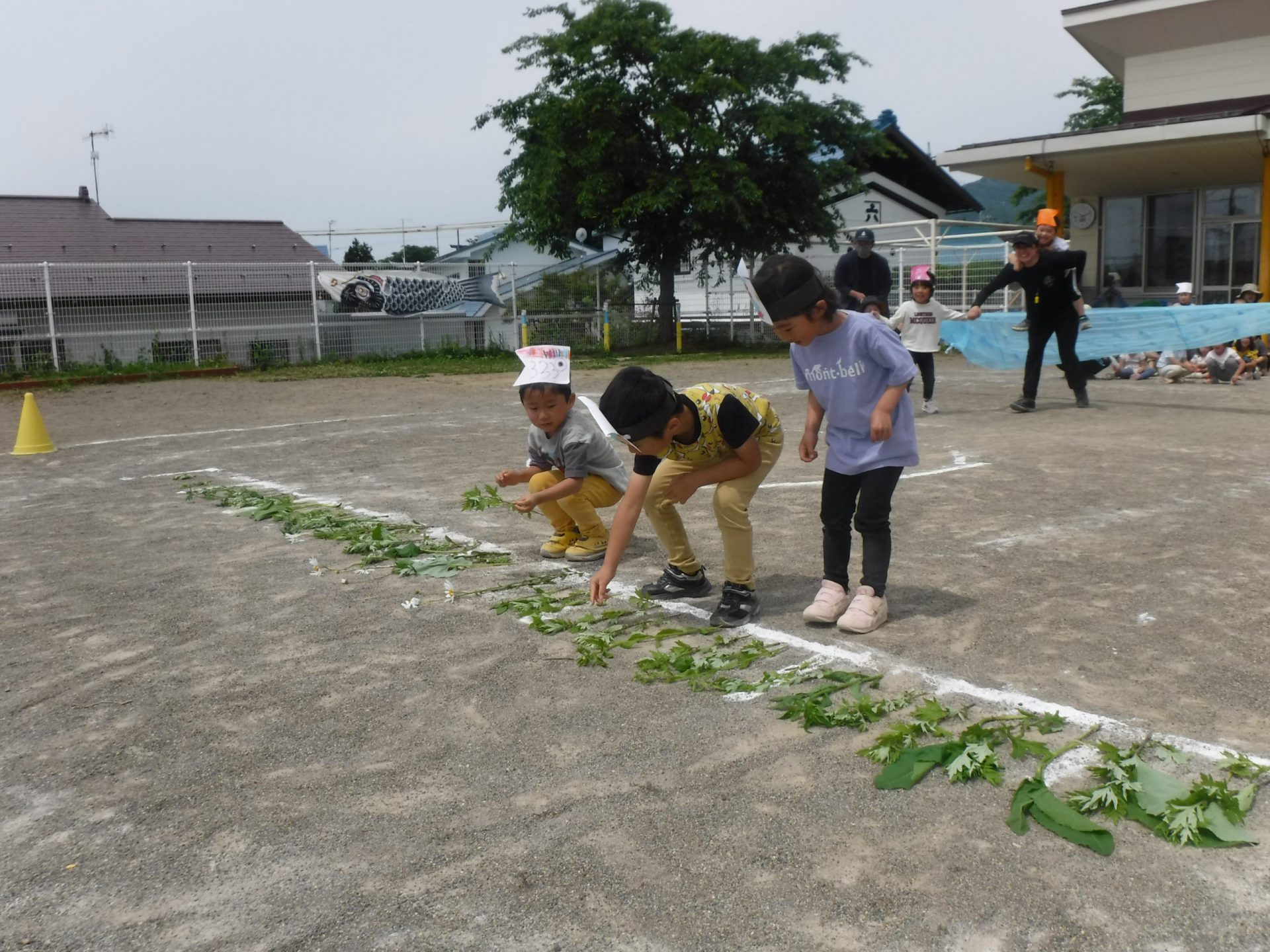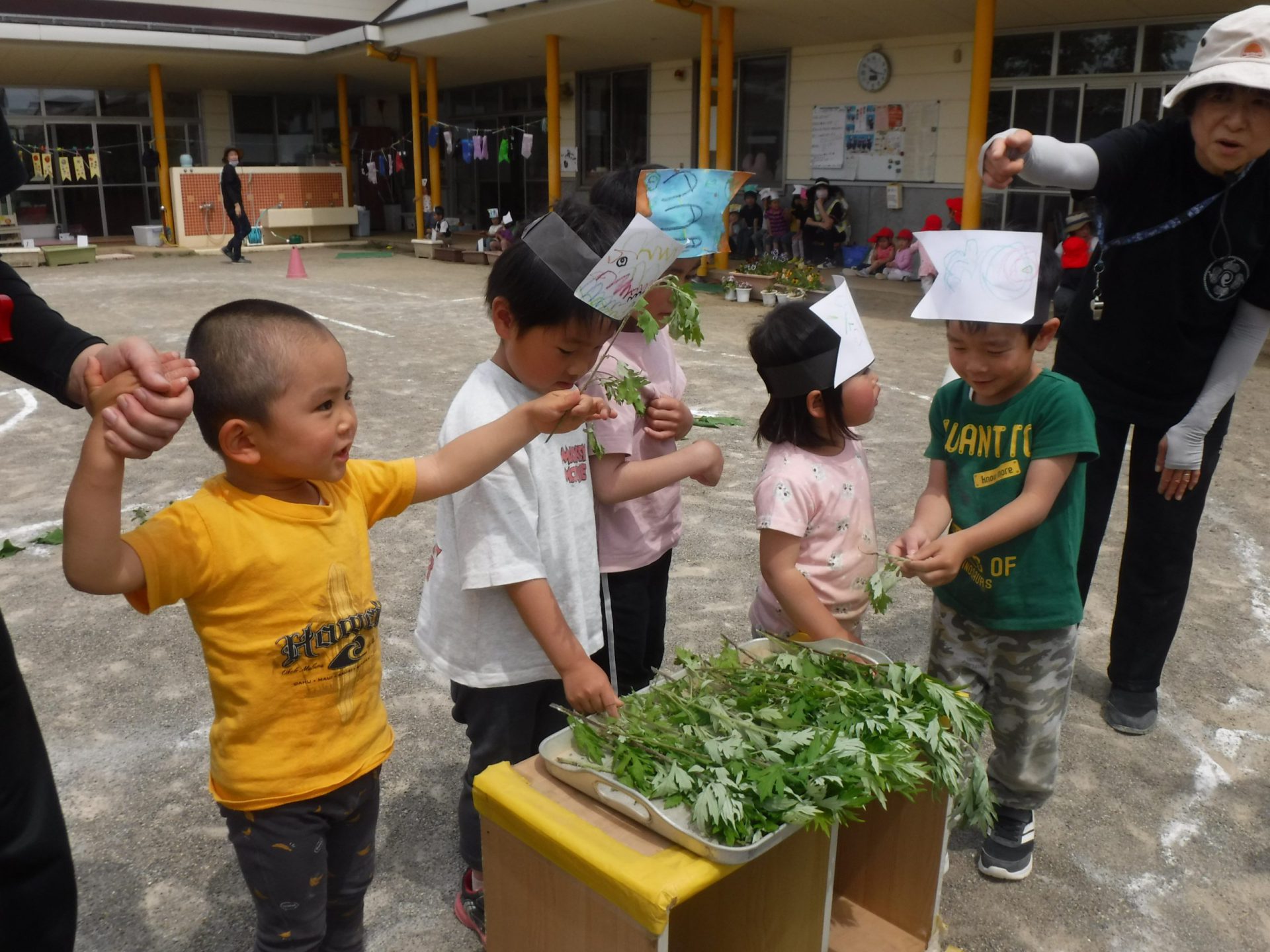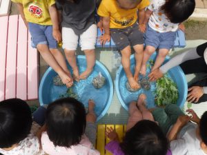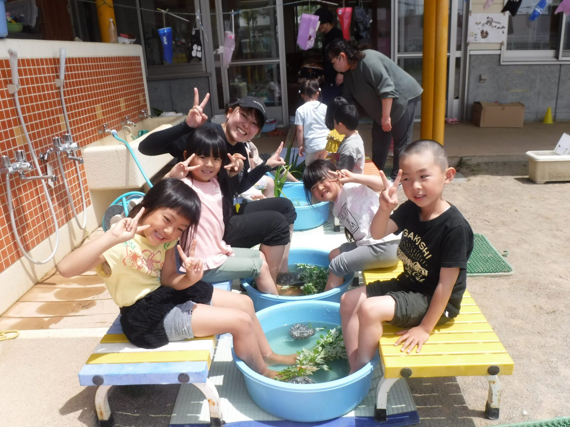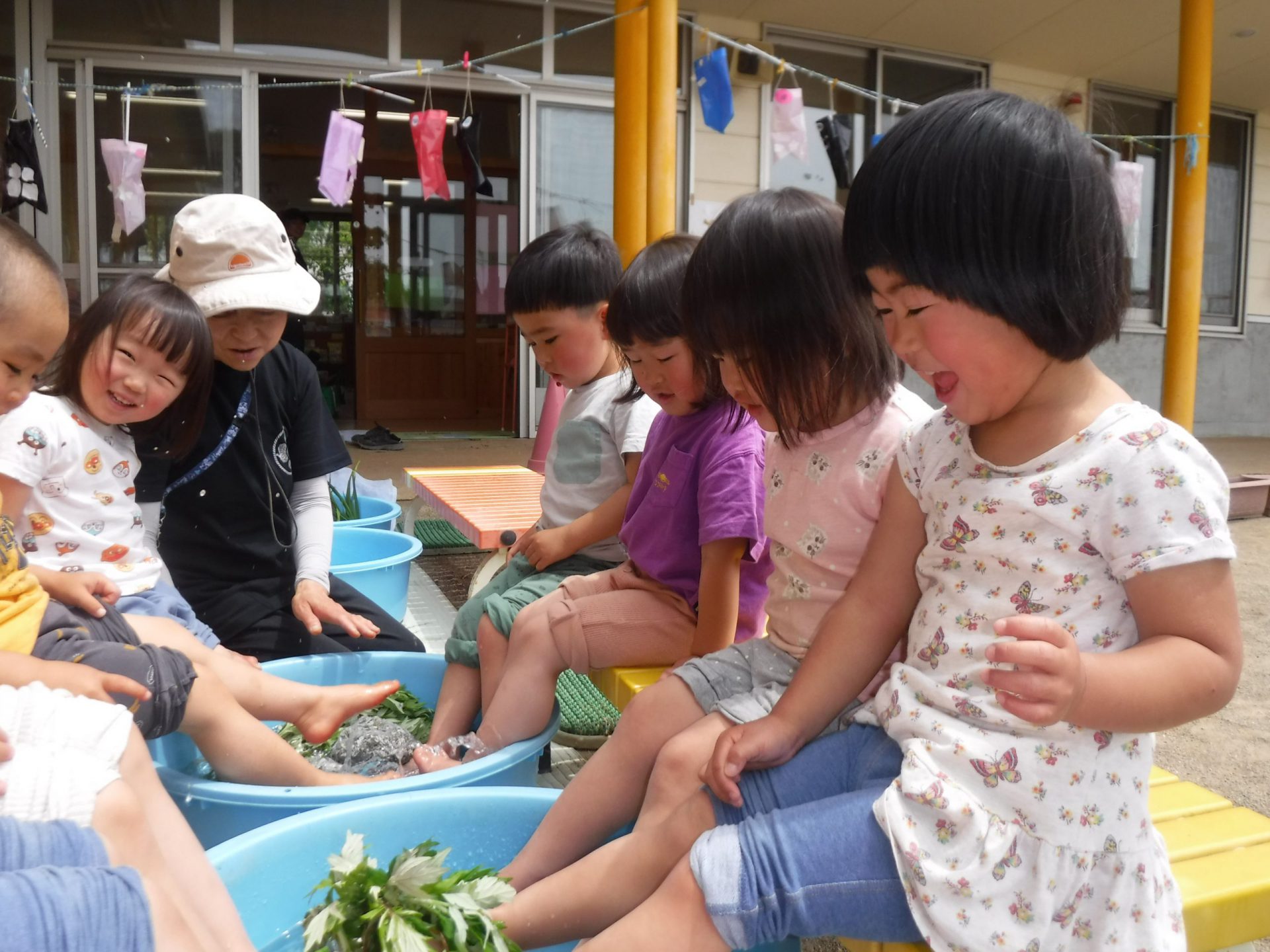 子ども達は、五感を使ってこいのぼりまつりを楽しんでいました。ヨモギや、ショウブの匂いを嗅いだり足湯の気持ちよさを堪能しました。