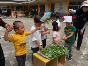 ヨモギを選んでゴールをしたらお盆にお供えします。