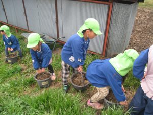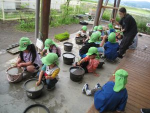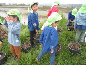 ↓4月、近くの田んぼから土をいただき、重いバケツを保育園まで一生懸命運びました。